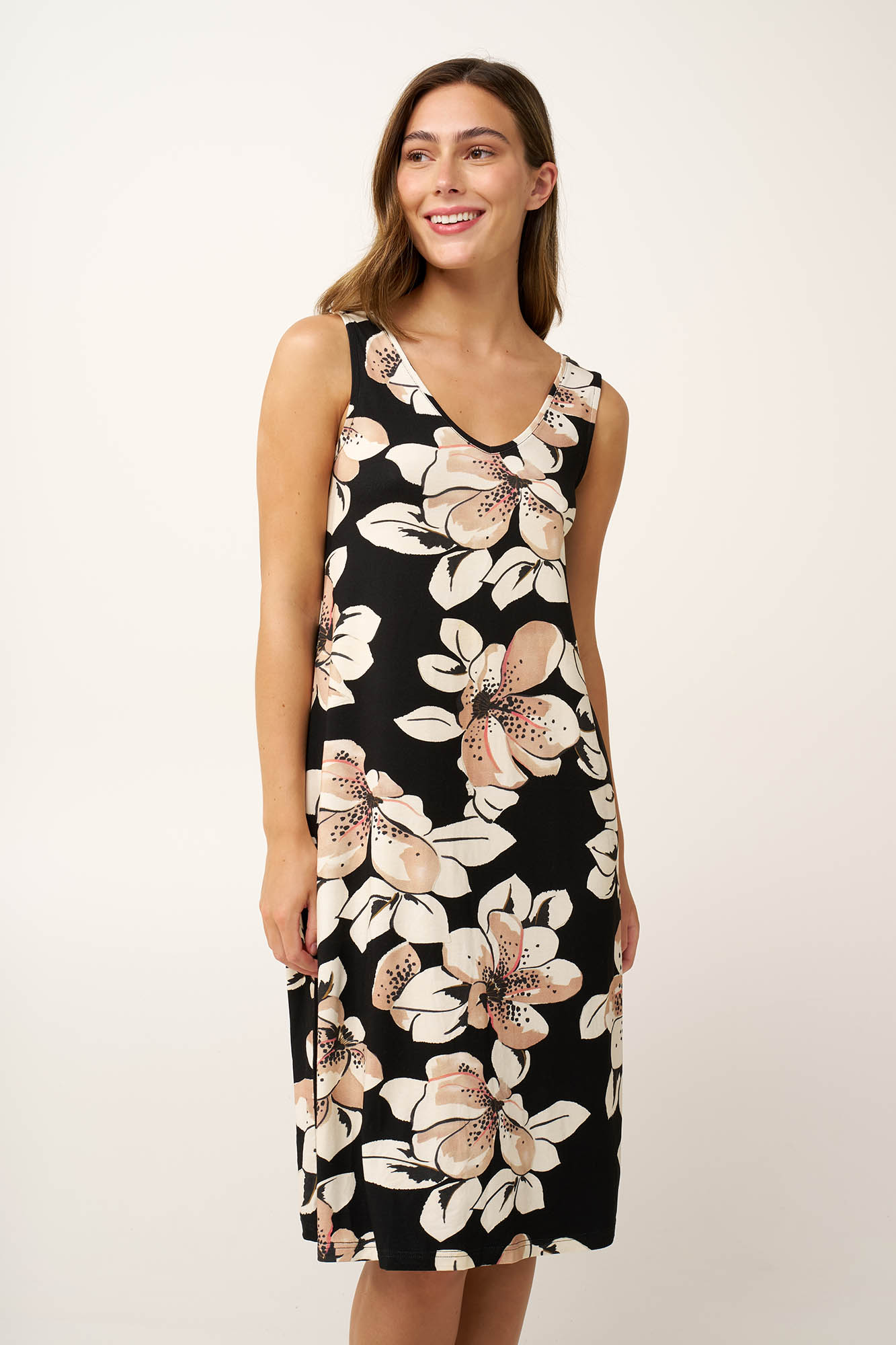 Ρομαντικά florals συναντούν την καθημερινή άνεση σε αυτό το καλοκαιρινό φόρεμα από απαλό μείγμα viscose και elastane. Το δροσερό ύφασμα προσφέρει φυσική ελαστικότητα και λεία εφαρμογή που αγκαλιάζει το σώμα χωρίς να σας περιορίζει. Διακοσμημένο με εντυπωσιακές μανόλιες σε μαύρη βάση, το print χαρίζει βάθος και χαρακτήρα. Μια κομψή επιλογή για καλοκαιρινές ημέρες αλλά και ζεστά βράδια.