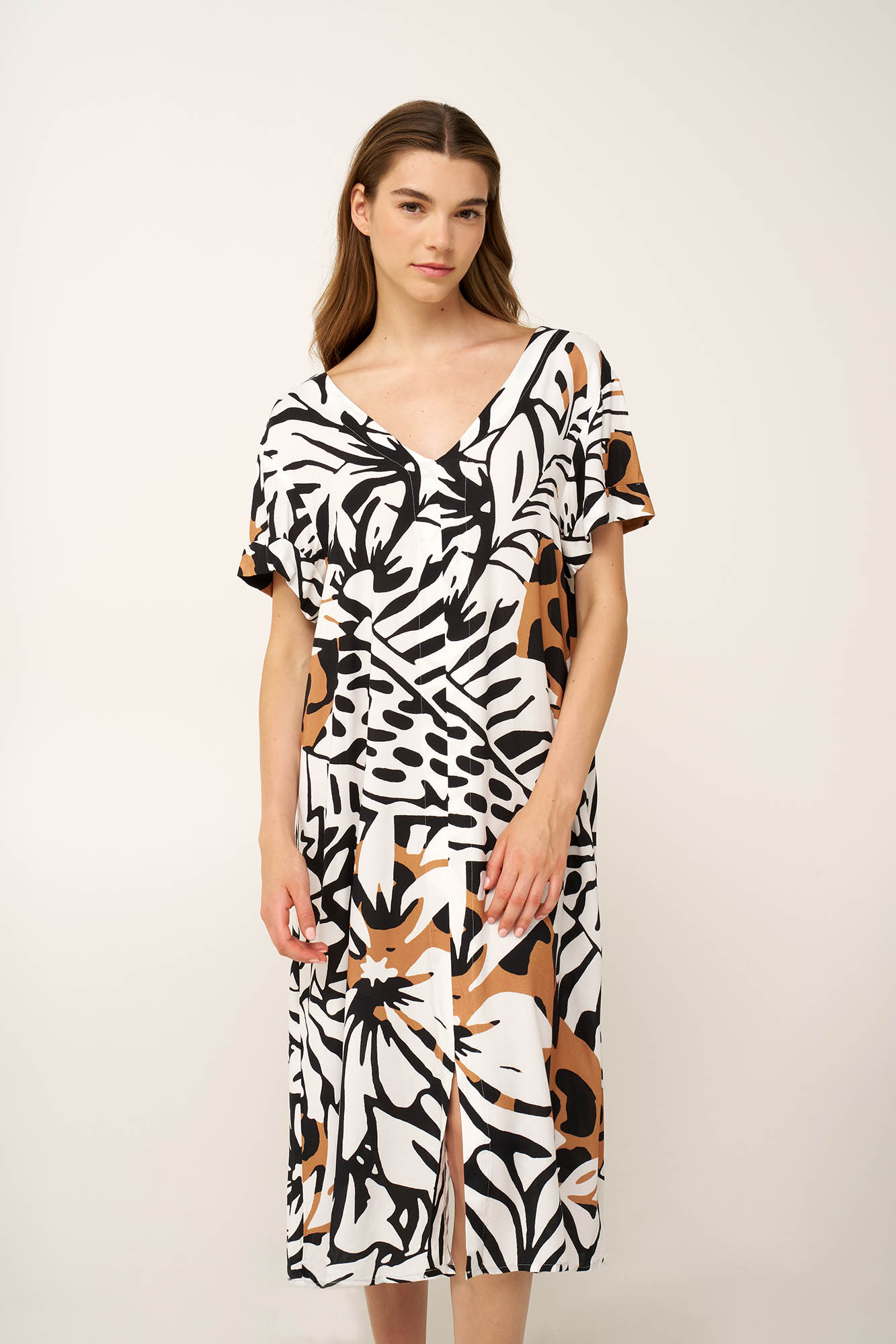Ανανεώστε τη διάθεση σας με αυτό το καλοκαιρινό φόρεμα, κατασκευασμένο από διαπνέον μείγμα ποπλίνας, viscose και λινού. Η V λαιμόκοψη μπροστά και πίσω προσθέτει θηλυκότητα, ενώ η χαλαρή γραμμή επιτρέπει ελευθερία κινήσεων καθ’ όλη τη διάρκεια της ημέρας. Ολοκληρώνετε με oversized τροπικά φύλλα σε ασπρόμαυρο αφρικανικό print, και ζεστούς τόνους της άμμου που δημιουργούν μια διακριτική αντίθεση. Εκφραστικό και εντυπωσιακό, είναι ιδανικό για τις καλοκαιρινές σας διακοπές.