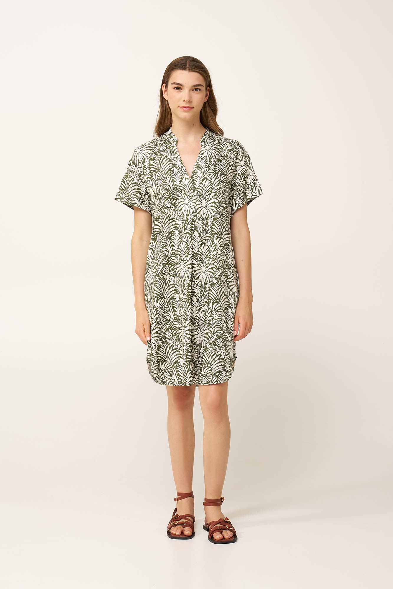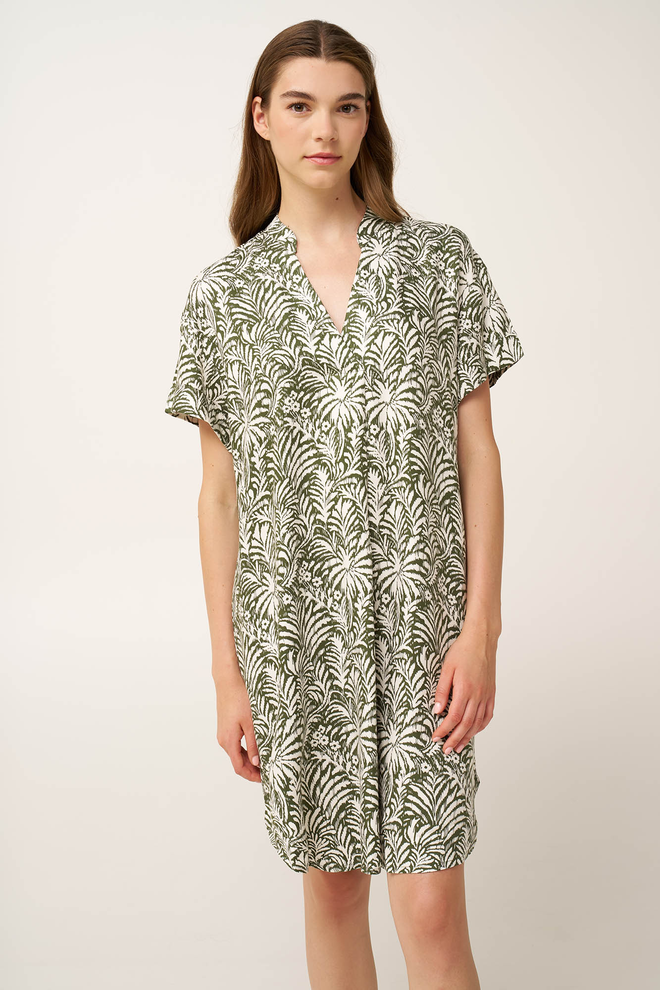Ανανεώστε την εμφάνιση σας με αυτό το κομψό καλοκαιρινό φόρεμα από δροσερή 100% ποπλίνα viscose. Σχεδιασμένο με κοντά μανίκια και λαιμόκοψη V, δημιουργεί μια καθαρή και δυναμική σιλουέτα με φυσική κίνηση. Διακοσμημένο με ένα jungle print ήπιων αντιθέσεων που προσφέρει βάθος και προσωπικότητα στο look, είναι ιδανικό για τις πιο ζεστές ημέρες των διακοπών ή της καθημερινότητας στην πόλη.