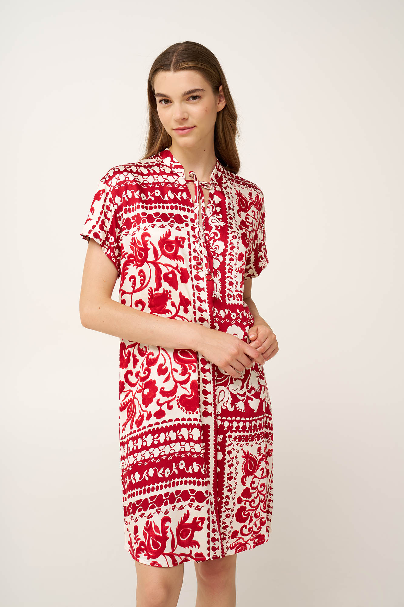 Επιλέξτε για τις ζεστές, ηλιόλουστες μέρες, αυτό το καλοκαιρινό φόρεμα, κατασκευασμένο από ελαφριά 100% viscose ποπλίνα που προσφέρει απαλή, διαπνέουσα αίσθηση και ακολουθεί την κίνηση του σώματος. Η λαιμόκοψη δένει μπροστά, προσθέτοντας μια χαλαρή, θηλυκή νότα, ενώ είναι σχεδιασμένο με ένα μωσαϊκό από παραδοσιακά μοτίβα σε κόκκινο τερακότα, που χαρίζει χαρακτήρα και μια αίσθηση καλοκαιρινής έκφρασης. δανικό για μέρες στην παραλία, βόλτες δίπλα στη θάλασσα ή χαλαρές καλοκαιρινές εξόδους.