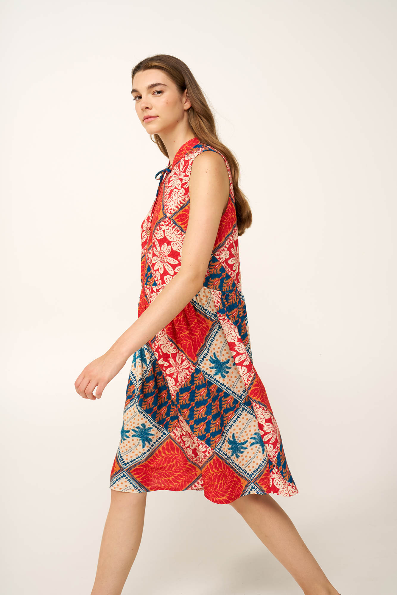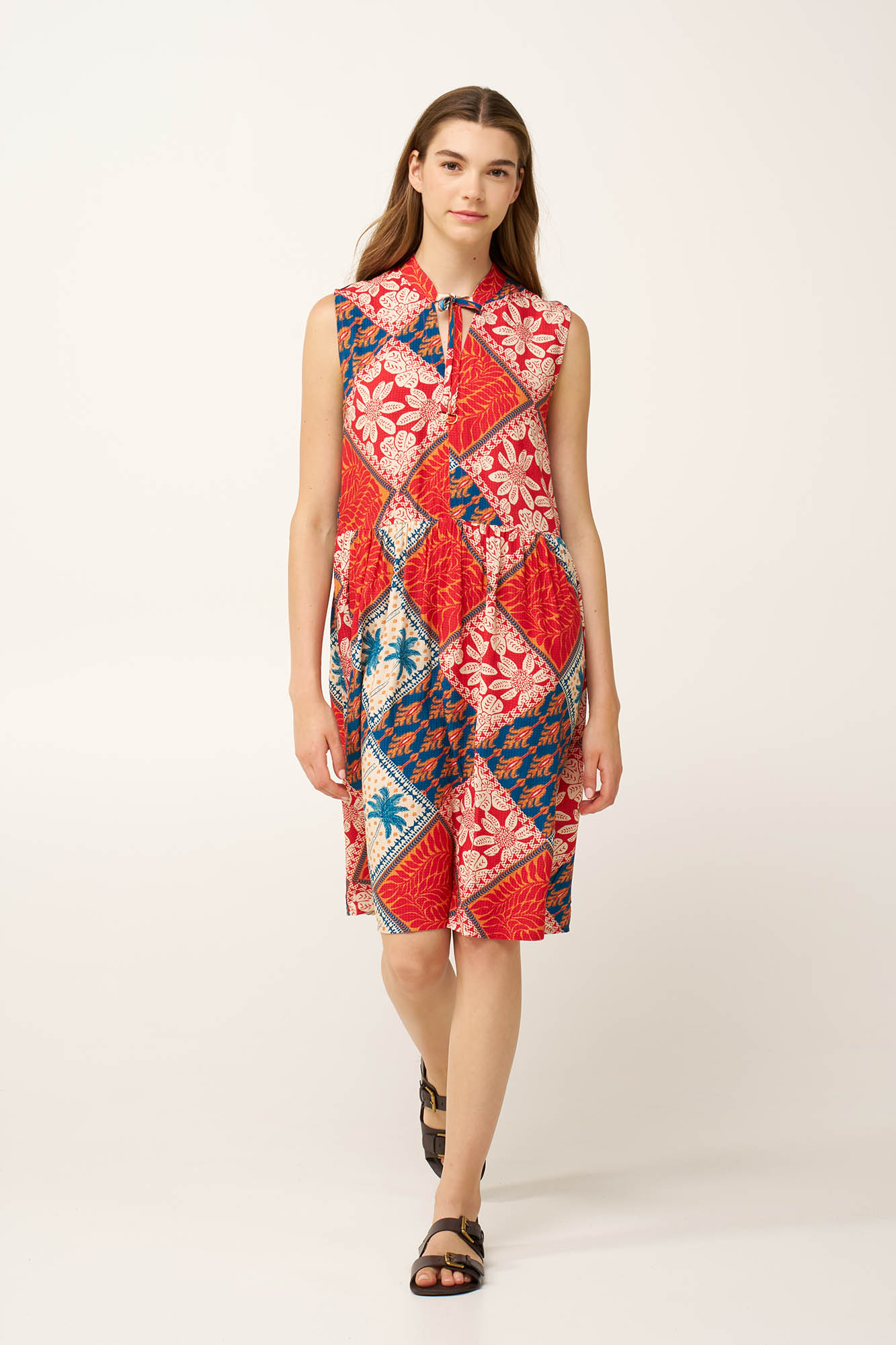 Ελαφρύ και εκφραστικό, αυτό το καλοκαιρινό φόρεμα είναι κατασκευασμένο από διαπνέουσα 100% viscose ποπλίνα, προσφέροντας αέρινη και δροσερή αίσθηση τις ζεστές μέρες. Σχεδιασμένο σε χαλαρή γραμμή, ακολουθεί τις κινήσεις του σώματος, ενώ ένα κολάζ βορειοαφρικάνικων τροπικών σε ζεστές αποχρώσεις ηλιοβασιλέματος, προσθέτει βάθος και statement δυναμική. Ιδανικό για εξορμήσεις στην παραλία ή χαλαρές καλοκαιρινές εμφανίσεις.