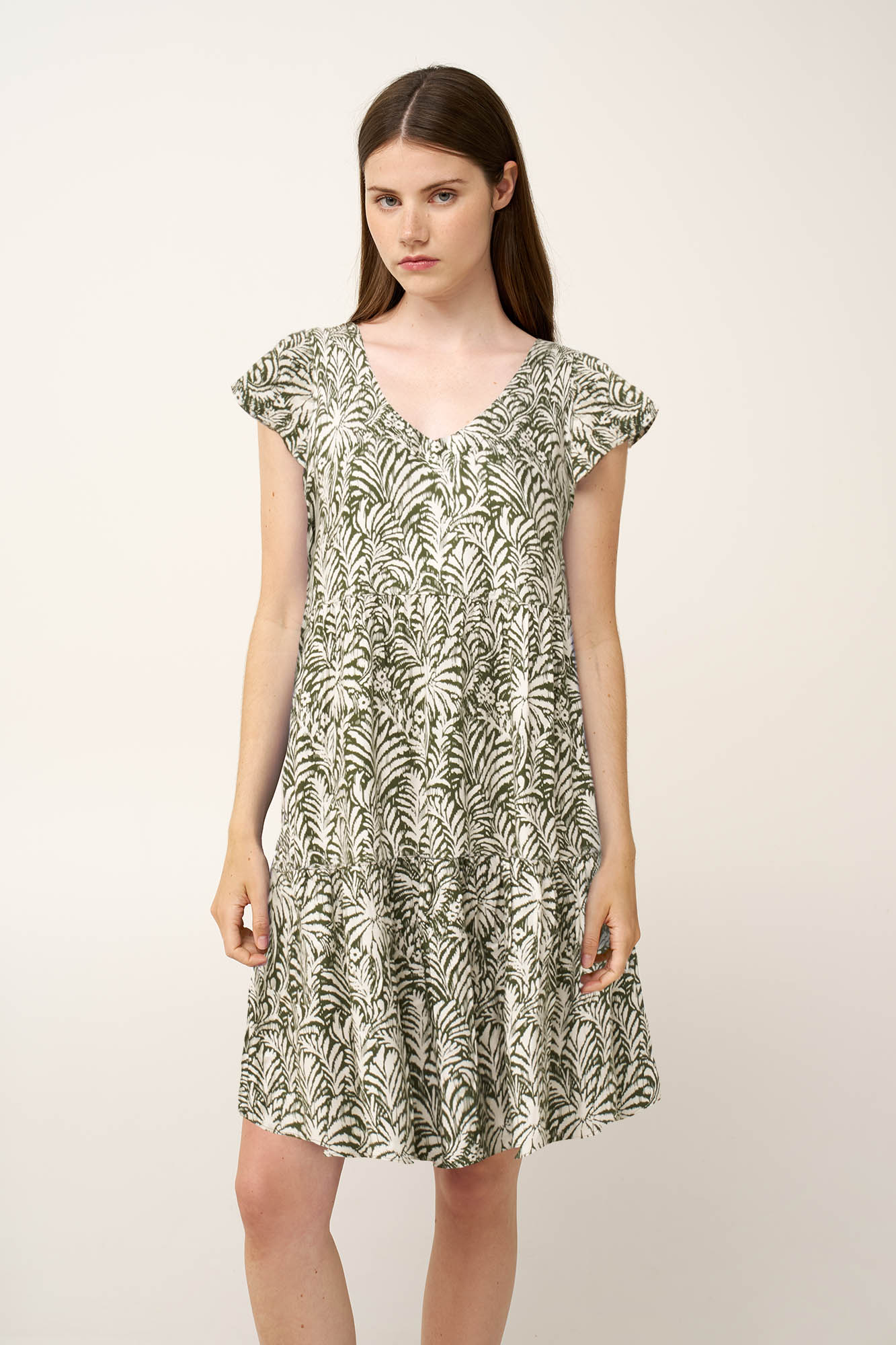 Απολαύστε κάθε στιγμή του καλοκαιριού, με αυτό το κομψό φόρεμα από διαπνέουσα 100% viscose ποπλίνα. Σχεδιασμένο με κοντά μανίκια και λαιμόκοψη V, προσφέρει μια καθαρή και δυναμική σιλουέτα που κινείται με χάρη μαζί με το σώμα. Διακοσμημένο με ένα jungle print ήπιων αντιθέσεων που προσφέρει βάθος και προσωπικότητα στο look. Ιδανικό για τις ημέρες των διακοπών ή την καθημερινότητα σας στην πόλη