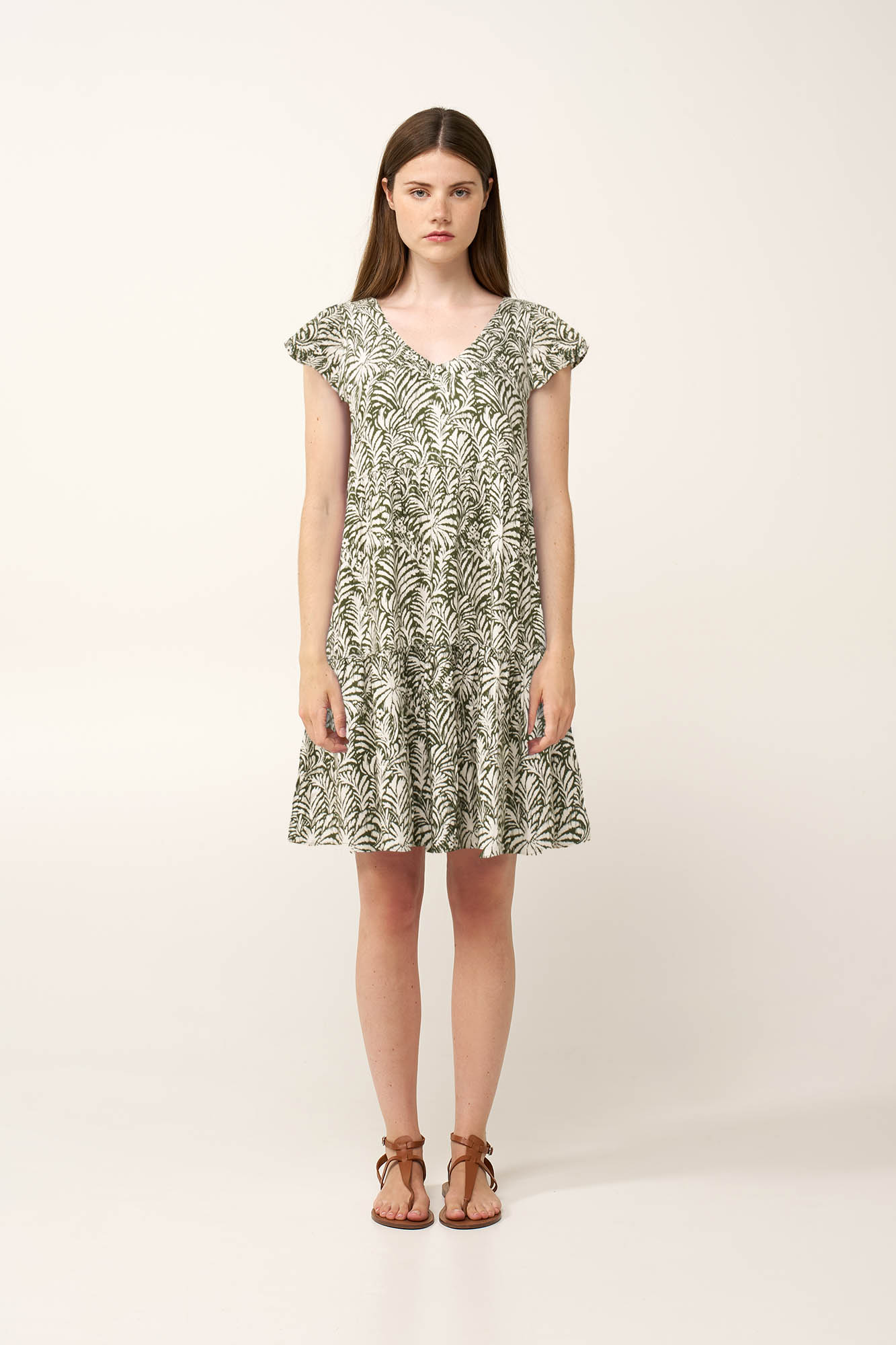 Απολαύστε κάθε στιγμή του καλοκαιριού, με αυτό το κομψό φόρεμα από διαπνέουσα 100% viscose ποπλίνα. Σχεδιασμένο με κοντά μανίκια και λαιμόκοψη V, προσφέρει μια καθαρή και δυναμική σιλουέτα που κινείται με χάρη μαζί με το σώμα. Διακοσμημένο με ένα jungle print ήπιων αντιθέσεων που προσφέρει βάθος και προσωπικότητα στο look. Ιδανικό για τις ημέρες των διακοπών ή την καθημερινότητα σας στην πόλη