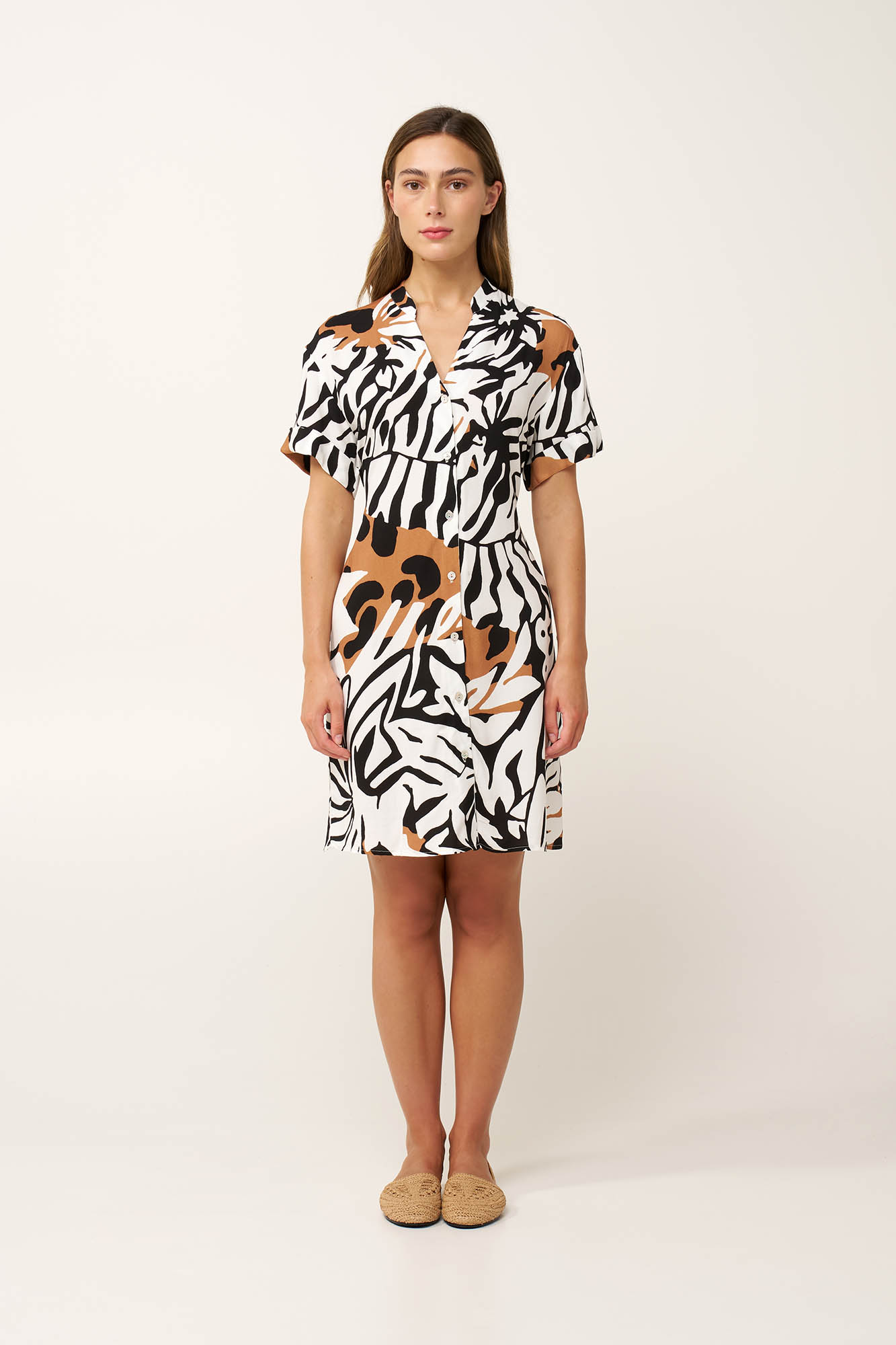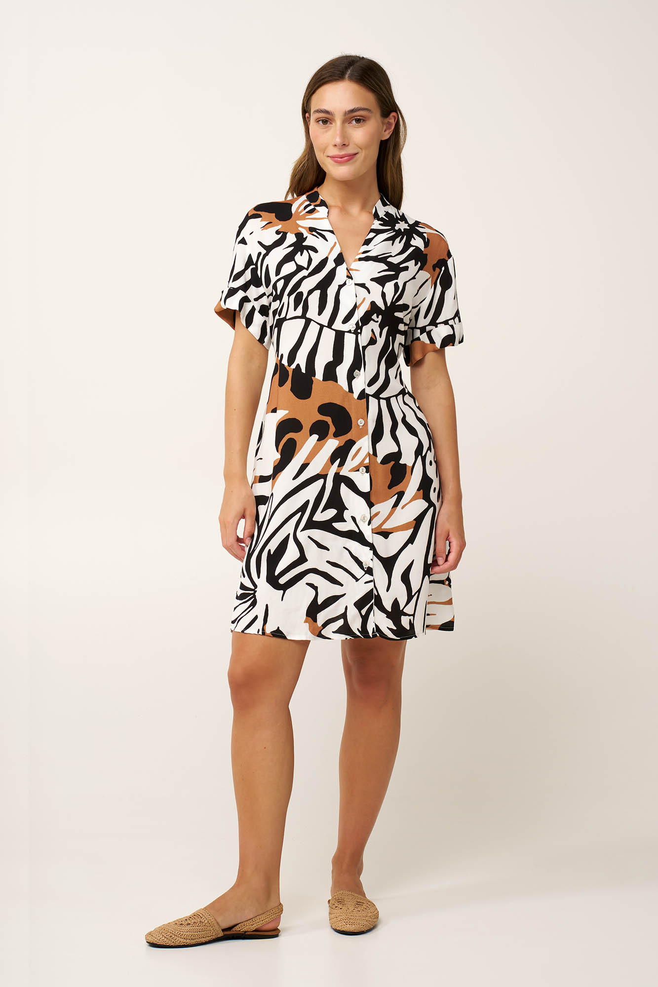 Προσθέστε στην γκαρνταρόμπα σας αυτό το καλοκαιρινό φόρεμα, κατασκευασμένο από ένα διαπνέον μείγμα ποπλίνας από viscose και λινό, για απαλή και ελαφριά αίσθηση. Το κουμπωτό μπροστινό μέρος προσθέτει κλασικό χαρακτήρα, ενώ ένα διακριτικό δέσιμο στο πίσω μέρος επιτρέπει να προσαρμόσετε την εφαρμογή. Σχεδιασμένο με oversized τροπικά φύλλα σε ασπρόμαυρο αφρικανικό print. Ιδανικό για καλοκαιρινές εξόδους ή χαλαρές αποδράσεις, συνδυάζει κομψότητα κα εκφραστικό, ατίθασο στυλ.