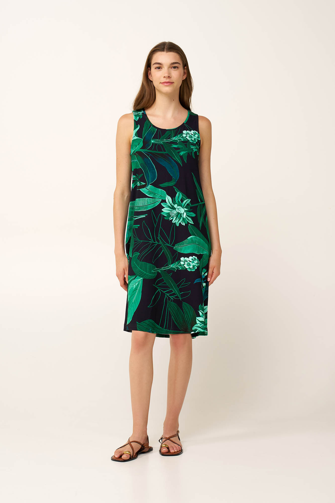 Ανανεώστε την εμφάνιση σας με αυτό το αμάνικο, καλοκαιρινό φόρεμα από απαλή viscose με elastane που προσφέρει άνεση και διακριτική ελαστικότητα, αγκαλιάζοντας απαλά το σώμα Διακοσμημένο με ένα βαθύ botanical print σε πλούσιες αποχρώσεις του πράσινου, θα φορεθεί ευχάριστα από το πρωί ως το βράδυ στις διακοπές ή την πόλη.