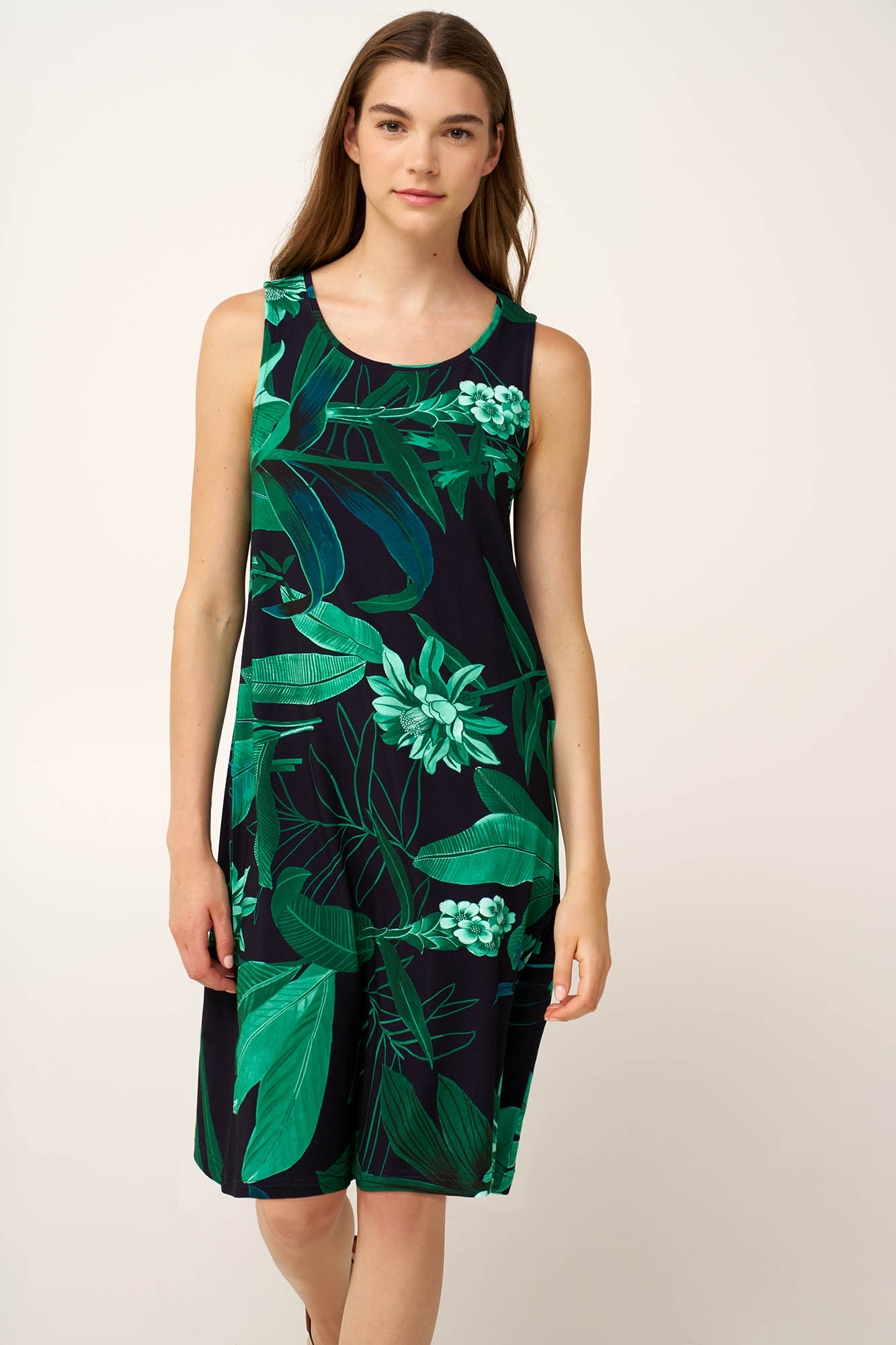 Ανανεώστε την εμφάνιση σας με αυτό το αμάνικο, καλοκαιρινό φόρεμα από απαλή viscose με elastane που προσφέρει άνεση και διακριτική ελαστικότητα, αγκαλιάζοντας απαλά το σώμα Διακοσμημένο με ένα βαθύ botanical print σε πλούσιες αποχρώσεις του πράσινου, θα φορεθεί ευχάριστα από το πρωί ως το βράδυ στις διακοπές ή την πόλη.