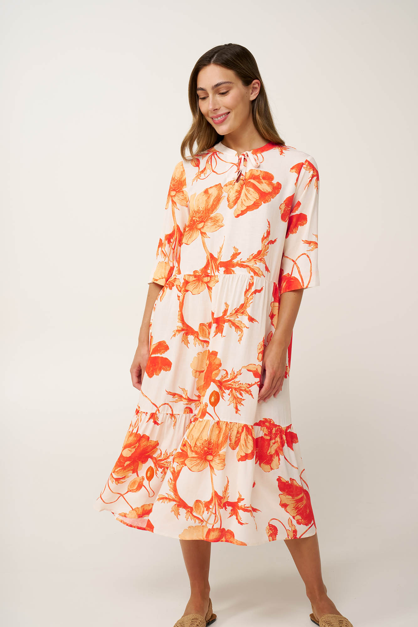 Προσθέστε στη συλλογή σας ένα μακρύ καλοκαιρνό φόρεμα από απαλή ποπλίνα viscose και λινού. Σχεδιασμένο με κοντά μανίκια και λαιμόκοψη που δένει μπροστά, προσφέρει χαλαρή εφαρμογλη ακολουθόντας την κίνηση του σώματος σας. Ένα φωτεινό floral print σε κοραλλί και φλογερές πορτοκαλί αποχρώσεις χαρίζει ζωντανια και ζωή στο look για να αποαλαύσετε ηλιοβασιλέματα και χαλαρές καλοκαιρινές στιγμές.