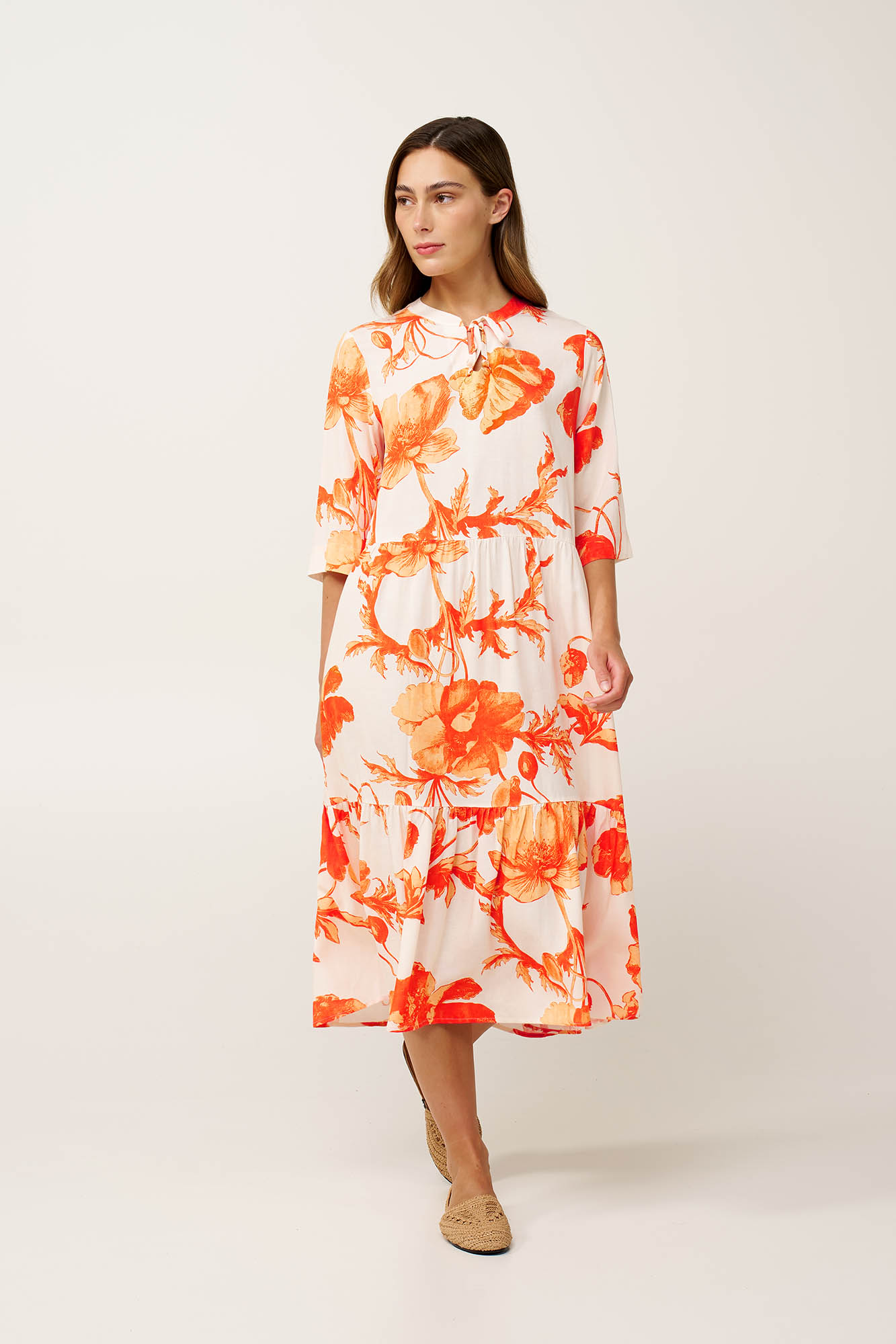 Προσθέστε στη συλλογή σας ένα μακρύ καλοκαιρνό φόρεμα από απαλή ποπλίνα viscose και λινού. Σχεδιασμένο με κοντά μανίκια και λαιμόκοψη που δένει μπροστά, προσφέρει χαλαρή εφαρμογλη ακολουθόντας την κίνηση του σώματος σας. Ένα φωτεινό floral print σε κοραλλί και φλογερές πορτοκαλί αποχρώσεις χαρίζει ζωντανια και ζωή στο look για να αποαλαύσετε ηλιοβασιλέματα και χαλαρές καλοκαιρινές στιγμές.