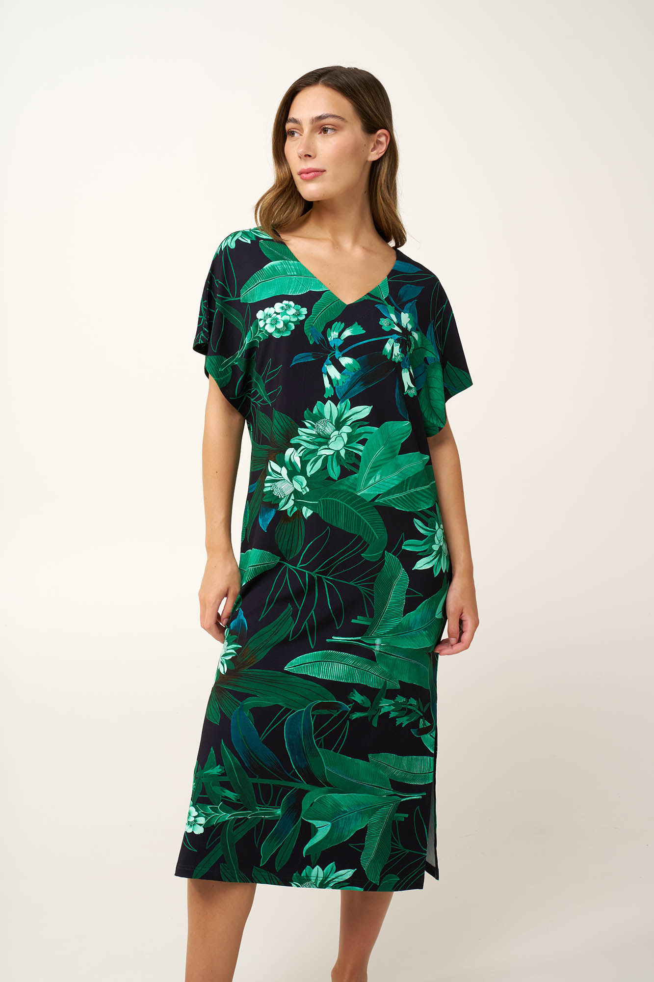 Ανανεώστε την καλοκαιρινή σας γκαρνταρόμπα με αυτό το φόρεμα από απαλό και δροσερό μείγμα viscose με elastane. Με χαλαρή γραμμή, κοντά μανίκια και λαιμόκοψη V μπροστά και πίσω, σας προσφέρει άνεση και ελευθερία κινήσεων . Το ελαφρύ ύφασμα πέφτει φυσικά στο σώμα, ενώ το βαθύ botanical print σε πράσινες αποχρώσεις χαρίζει πλούσιο, καθηλωτικό βάθος. Ιδανικό για βόλτες στην παραλία ή για χαλαρές στιγμές στην πόλη.