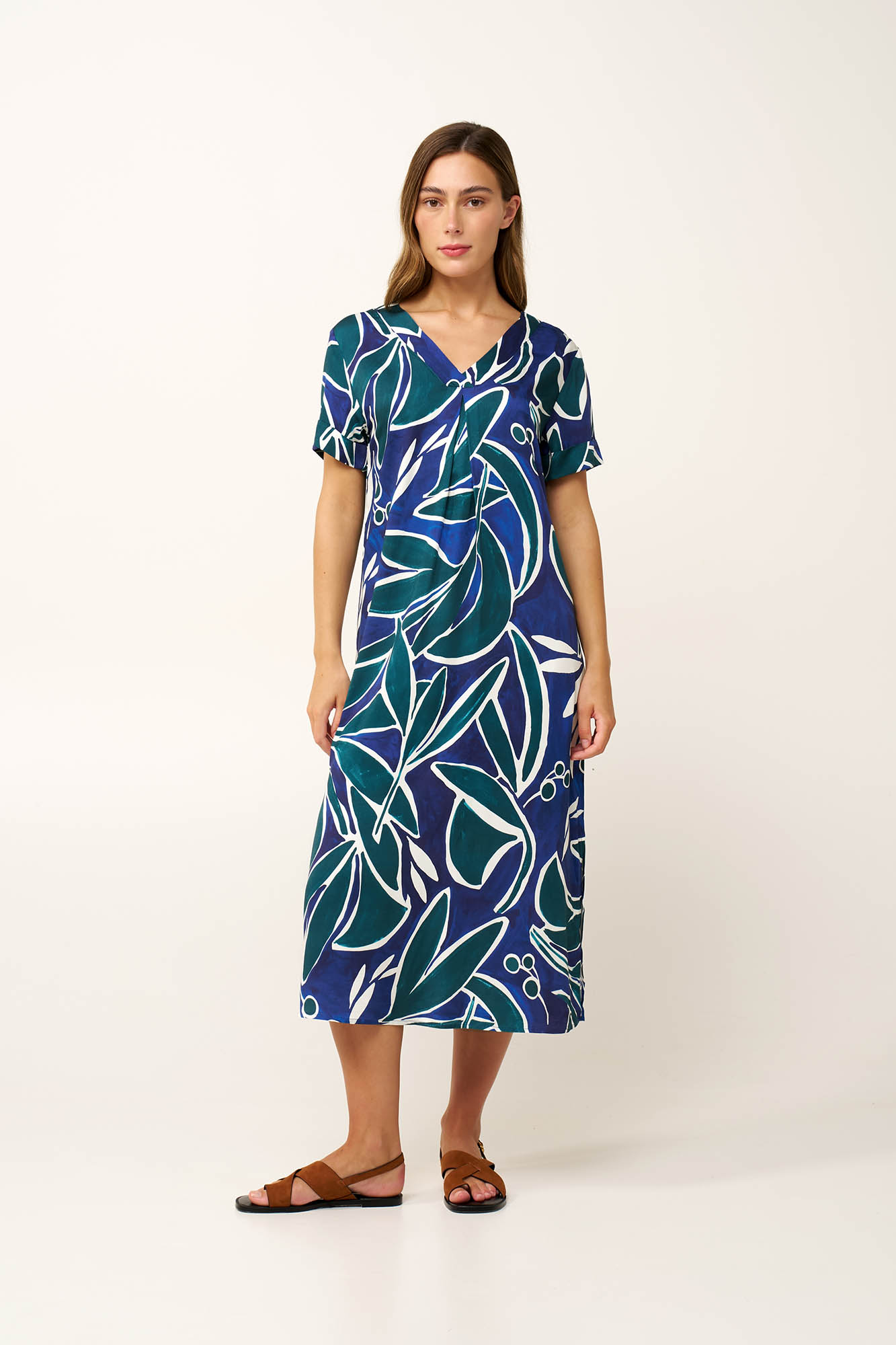 Ανανεώστε το καλοκαιρινό σας στυλ με αυτό το μακρύ φόρεμα από 100% viscose ποπλίνα, που προσφέρει απαλή υφή και δροσερή αίσθηση όλη μέρα. Η V λαιμόκοψη δίνει μια καθαρή, θηλυκή γραμμή, ενώ η πιέτα στο μπροστινό μέρος χαρίζει όμορφη κίνηση και πιο χαλαρή εφαρμογή. Πέφτει ανάλαφρα στο σώμα και κινείται φυσικά σε κάθε βήμα, δημιουργώντας μια εμφάνιση απλή αλλά εντυπωσιακή. Το έντονο γραφικό print με αφηρημένα σχήματα σε ωκεάνιους τόνους προσθέτει φρεσκάδα και σύγχρονο χαρακτήρα, κάνοντάς το ιδανικό για καλοκαιρινές μέρες στην πόλη ή στις διακοπές.