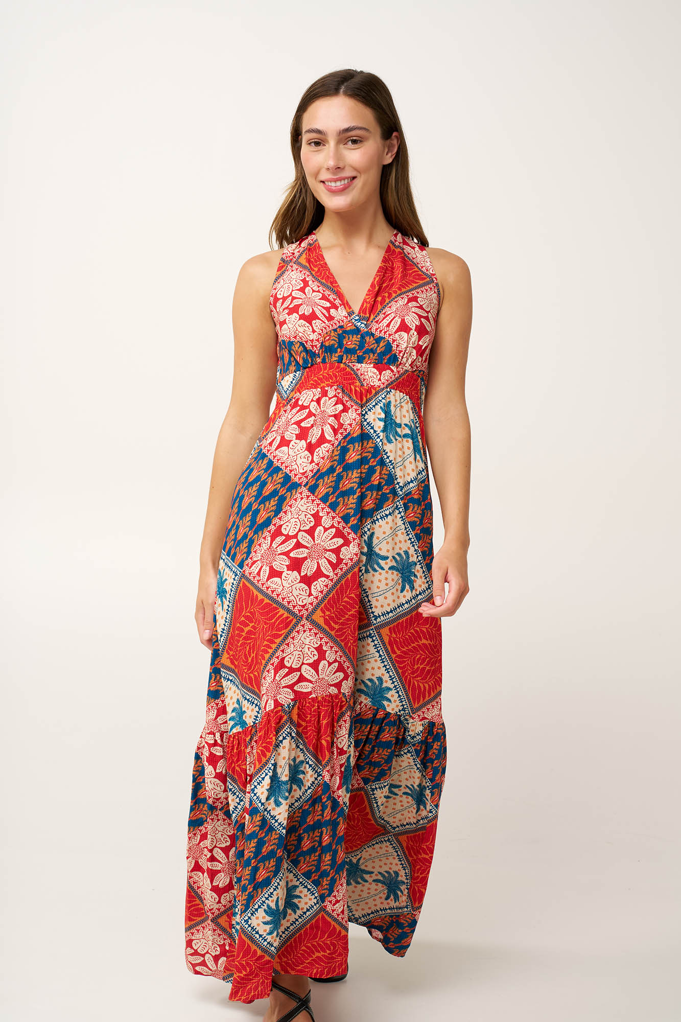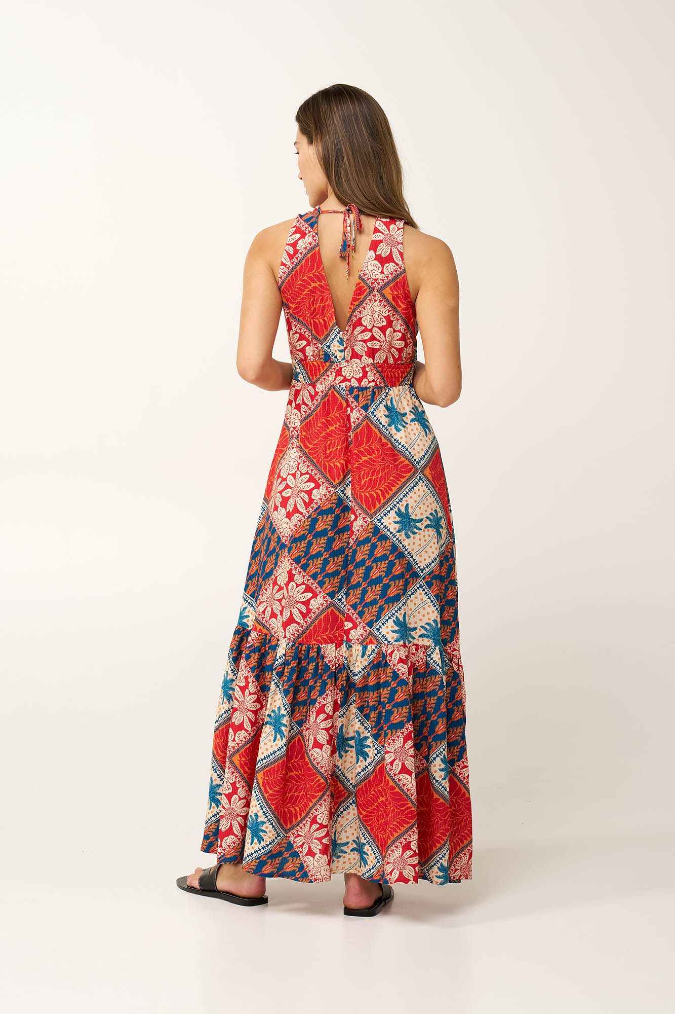 Προσθέστε στην γκαρνταρόμπα σας, αυτό το μακρύ καλοκαιρινό φόρεμα, κατασκευασμένο από ανάλαφρη 100% viscose ποπλίνα, προσφέροντας απαλή και αέρινη αίσθηση. Σχεδιασμένο σε χαλαρή γραμμή, ακολουθεί με ευκολία τις κινήσεις του σώματος. Ένα κολάζ βορειοαφρικάνικων τροπικών σε ζεστές αποχρώσεις ηλιοβασιλέματος, προσδίδει χαρακτήρα και εκφραστικότητα στην εμφάνιση σας. Ελαφρύ αλλά εντυπωσιακό, είναι ιδανικό για βραδιές δίπλα στη θάλασσα, καλοκαιρινές αποδράσεις και ηλιόλουστες μέρες διακοπών.