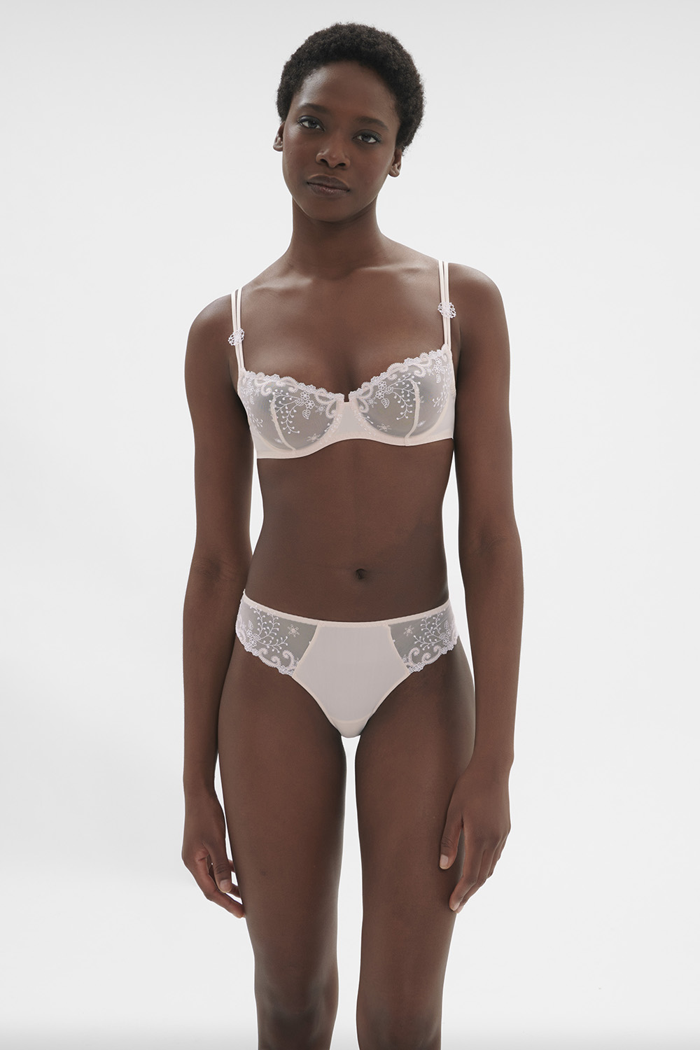 Γυναικείο απαλό ροζ σουτιέν Simone Pérèle floral κεντήματα και guipure δαντέλα. Σουτιέν Half Cup με μπανέλα χωρίς ενίσχυση ρομαντικό και σαγηνευτικό. Εσωτερική ενίσχυση από τούλι στο πλάι των cup για καλύτερη υποστήριξη και τιράντες διακοσμημένες με δαντέλα.