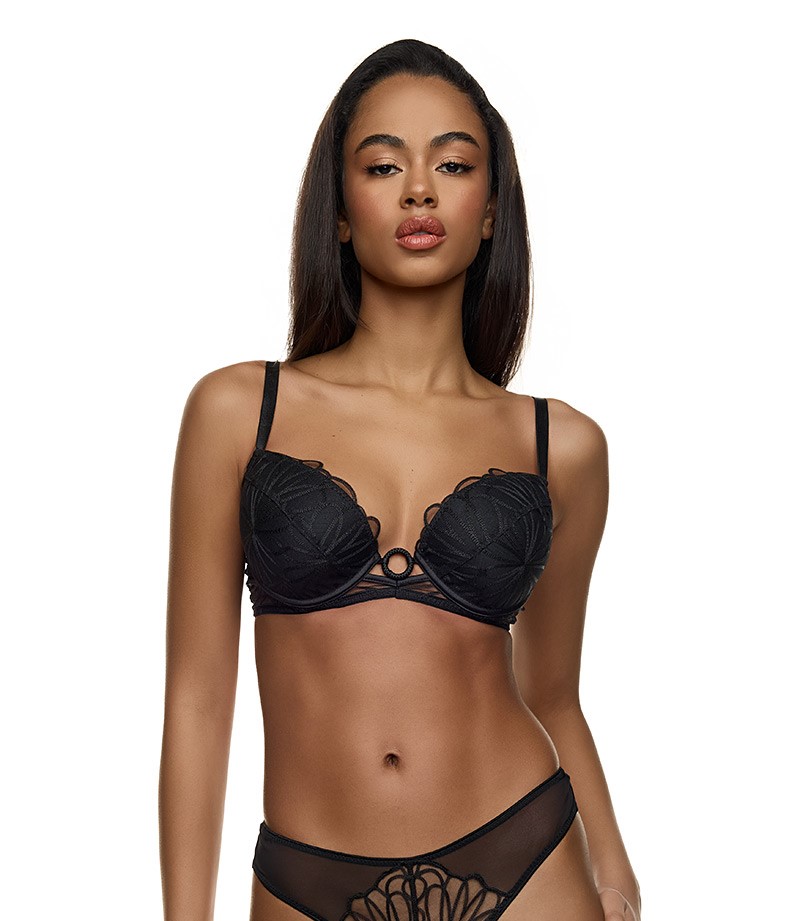 Σουτιέν MED MARIZA από αισθησιακό μαύρο floral ύφασμα με κόσμημα ανάμεσα στα cups και λεπτές τιράντες για εντυπωσιακές εμφανίσεις. Cups με ενίσχυση και μπανέλα.