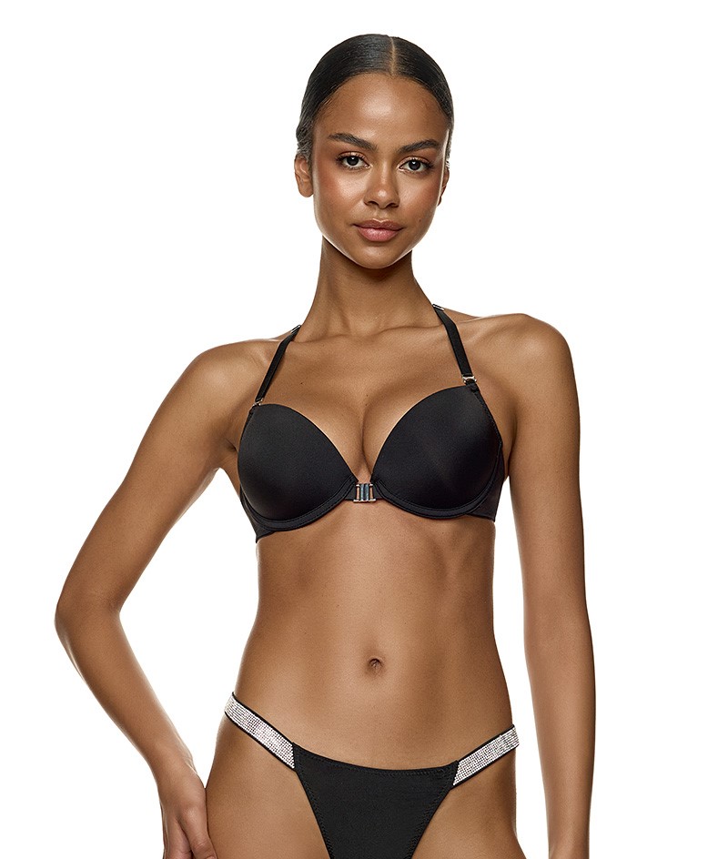 Σουτιέν push up MED Diamond - Μαύρο. Cups με μεγάλη ενίσχυση και μπανέλα, ιδανικό για ανοιχτές πλάτες όπου το αποτέλεσμα με τα διαμαντάκια είναι εντυπωσιακό, σταθερή πλάτη και κούμπωμα μπροστά.