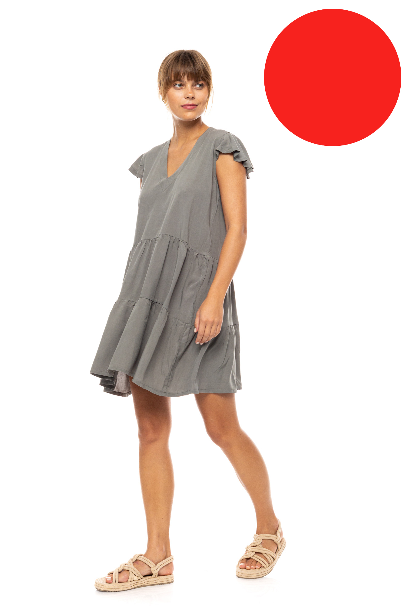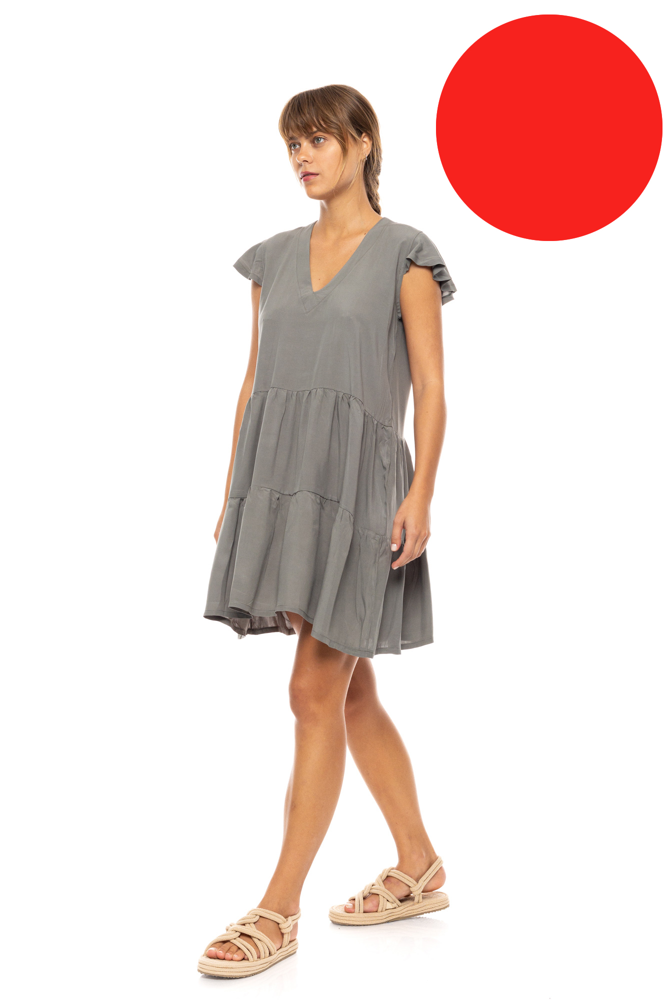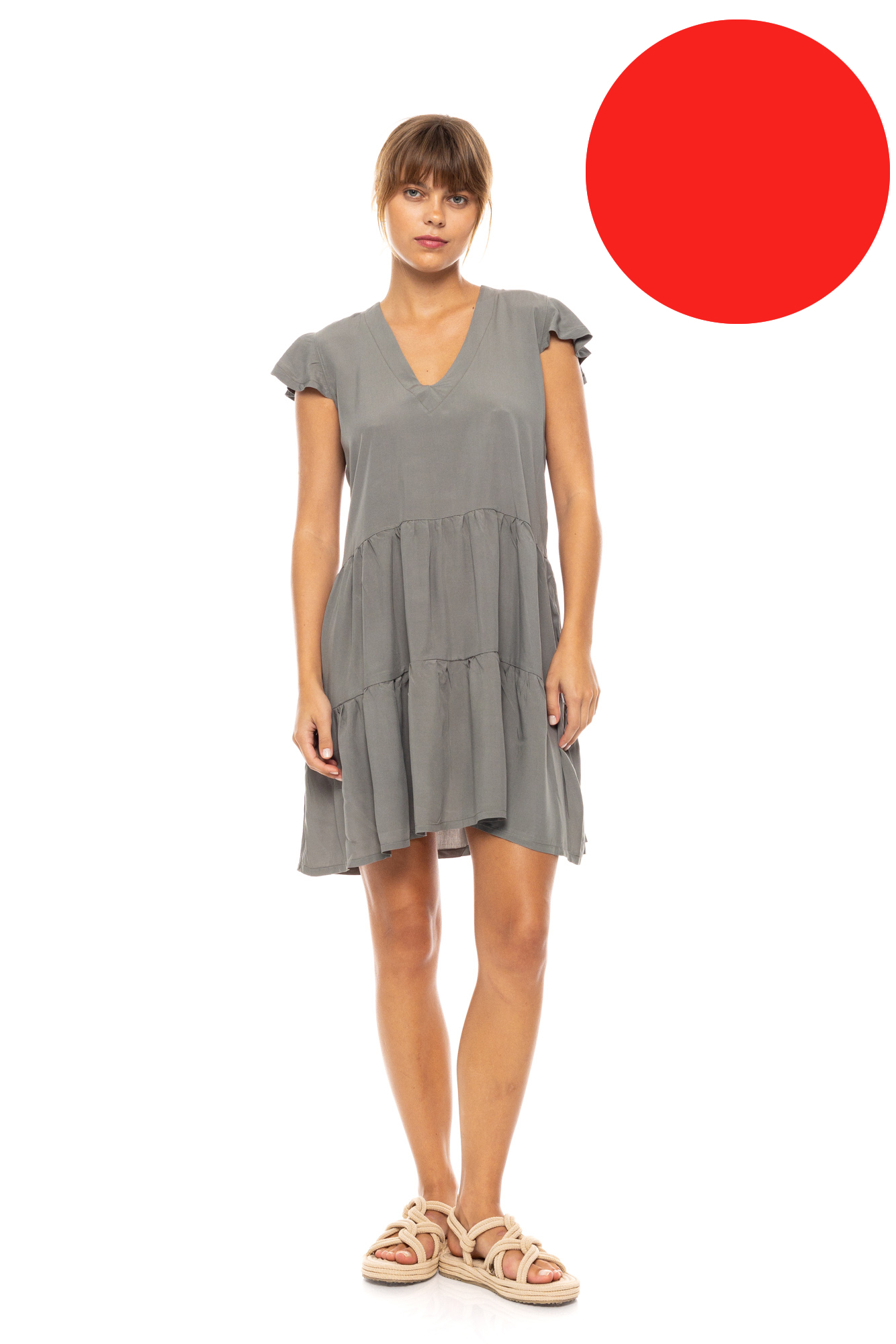 Γυναικείο Beachdress Pink Label κόκκινο κοντό σε άνετη γραμμή με αμάνικο με βολάν. Φόρεμα παραλίας με άνοιγμα V στο στήθος, 100% Viscose.