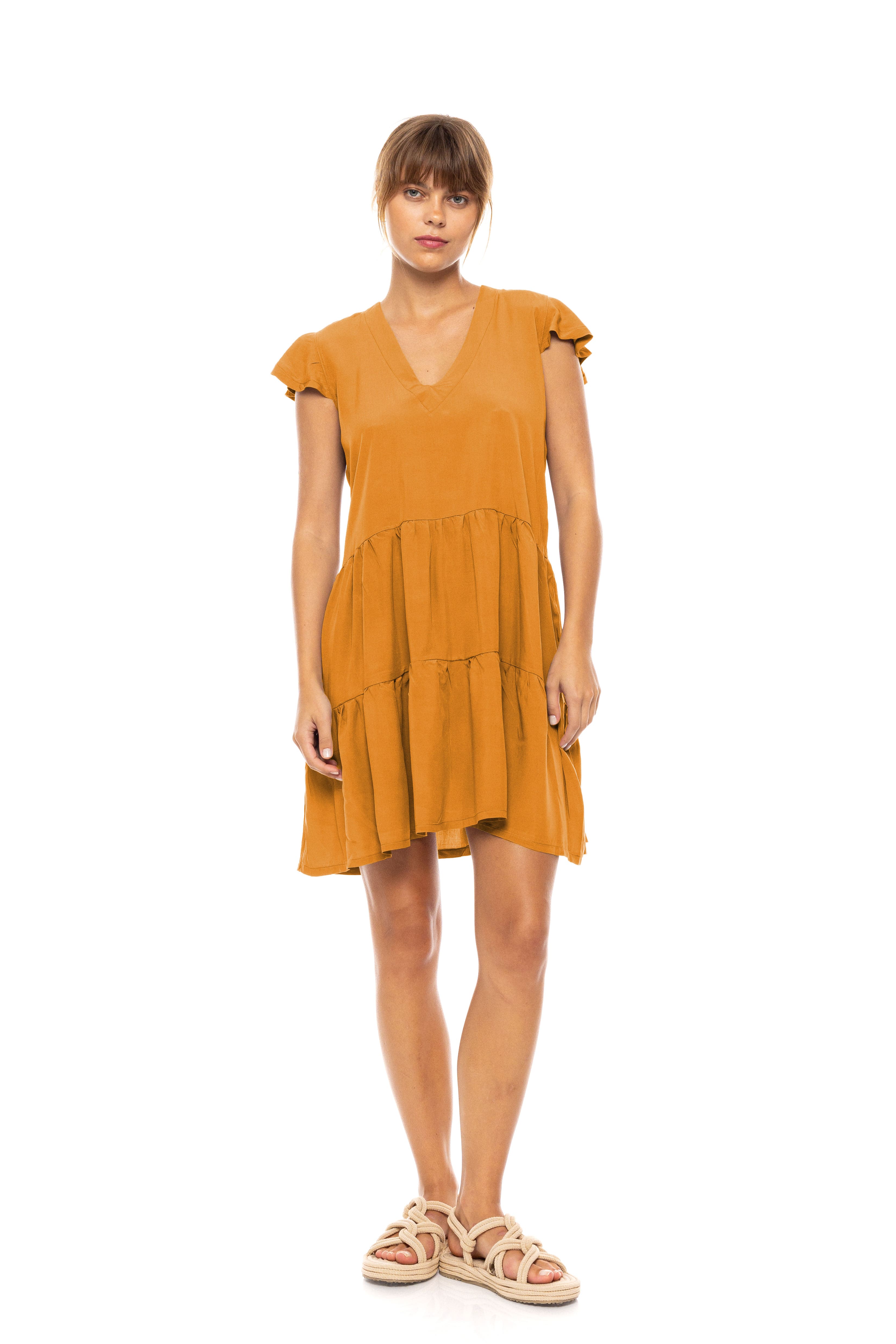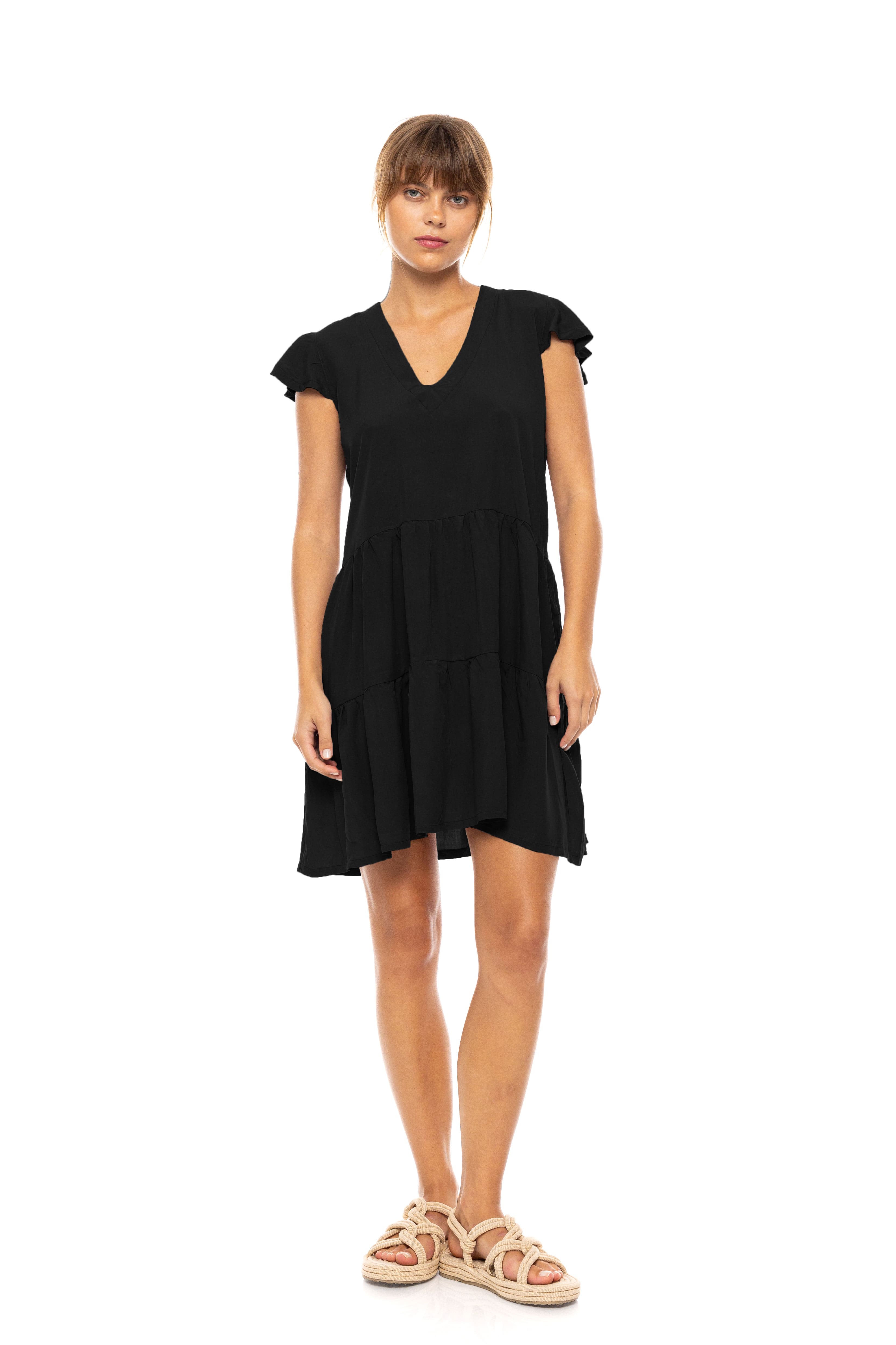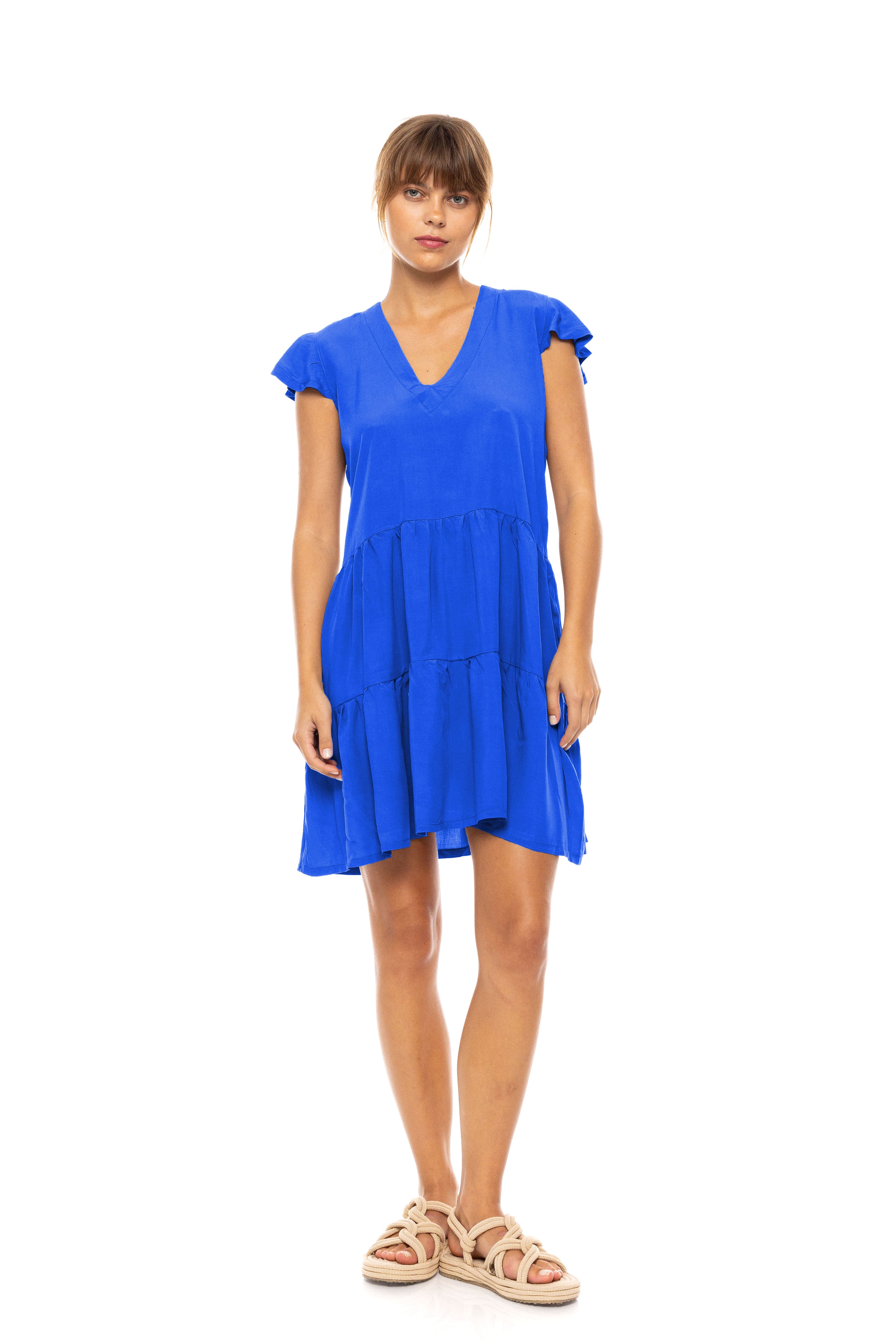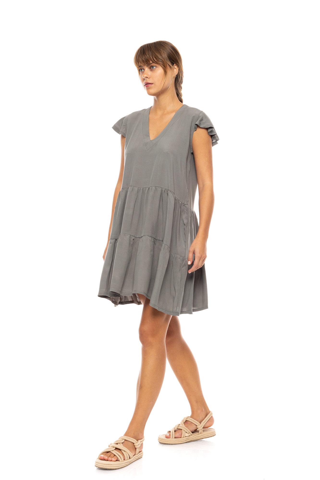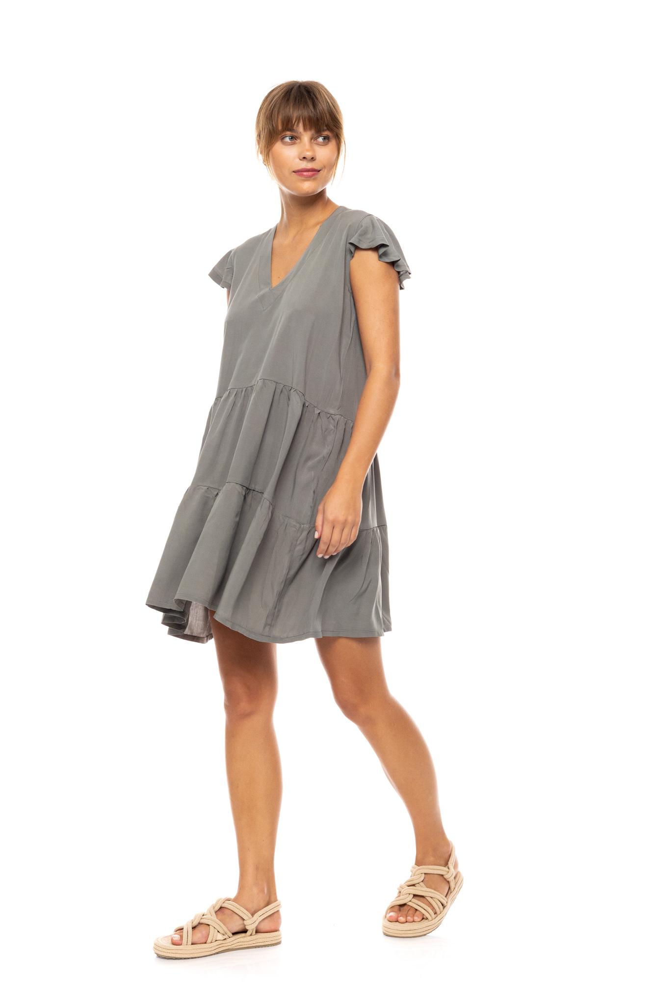 Γυναικείο Beachdress Pink Label Oil Green κοντό σε άνετη γραμμή με αμάνικο με βολάν. Φόρεμα παραλίας με άνοιγμα V στο στήθος, 100% Viscose.
