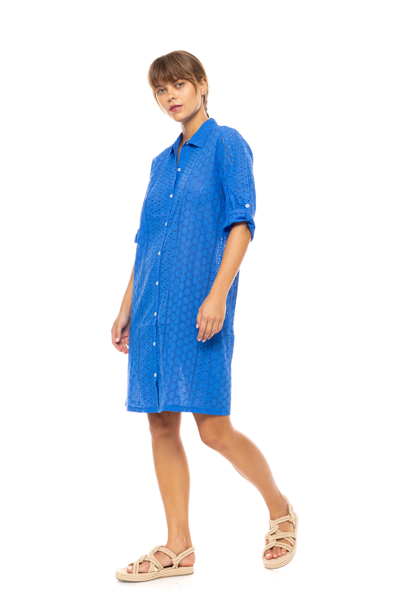 Γυναικείο Beachdress Pink Label Indigo σεμιζιέ, κοντό σε ίσια γραμμή με μανίκια 3/4. Φόρεμα παραλίας με κοφτό κέντημα και γιακά, 100% Cotton