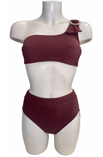 Γυναικείο μαγιό σετ Lida, καφέ Bronze με σταθερό κούμπωμα στην πλάτη και λεπτομέρεις με τόκα στομ ώμο. Μπικίνι Crop top με έναν ώμο,