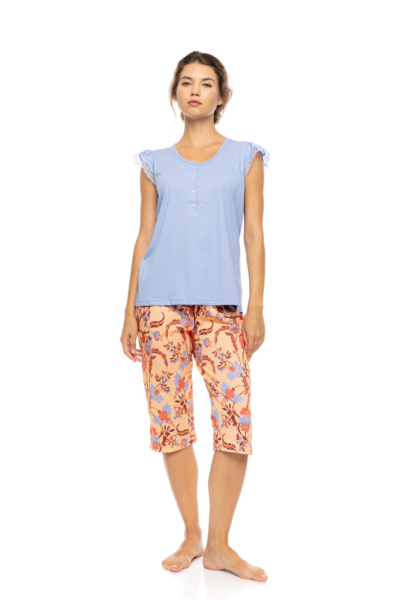 Γυναικεία Πυτζάμα Pink Label - TROPICAL FLOWER - Κάπρι - Κοντομάνικη Με πατιλέτα - Cotton