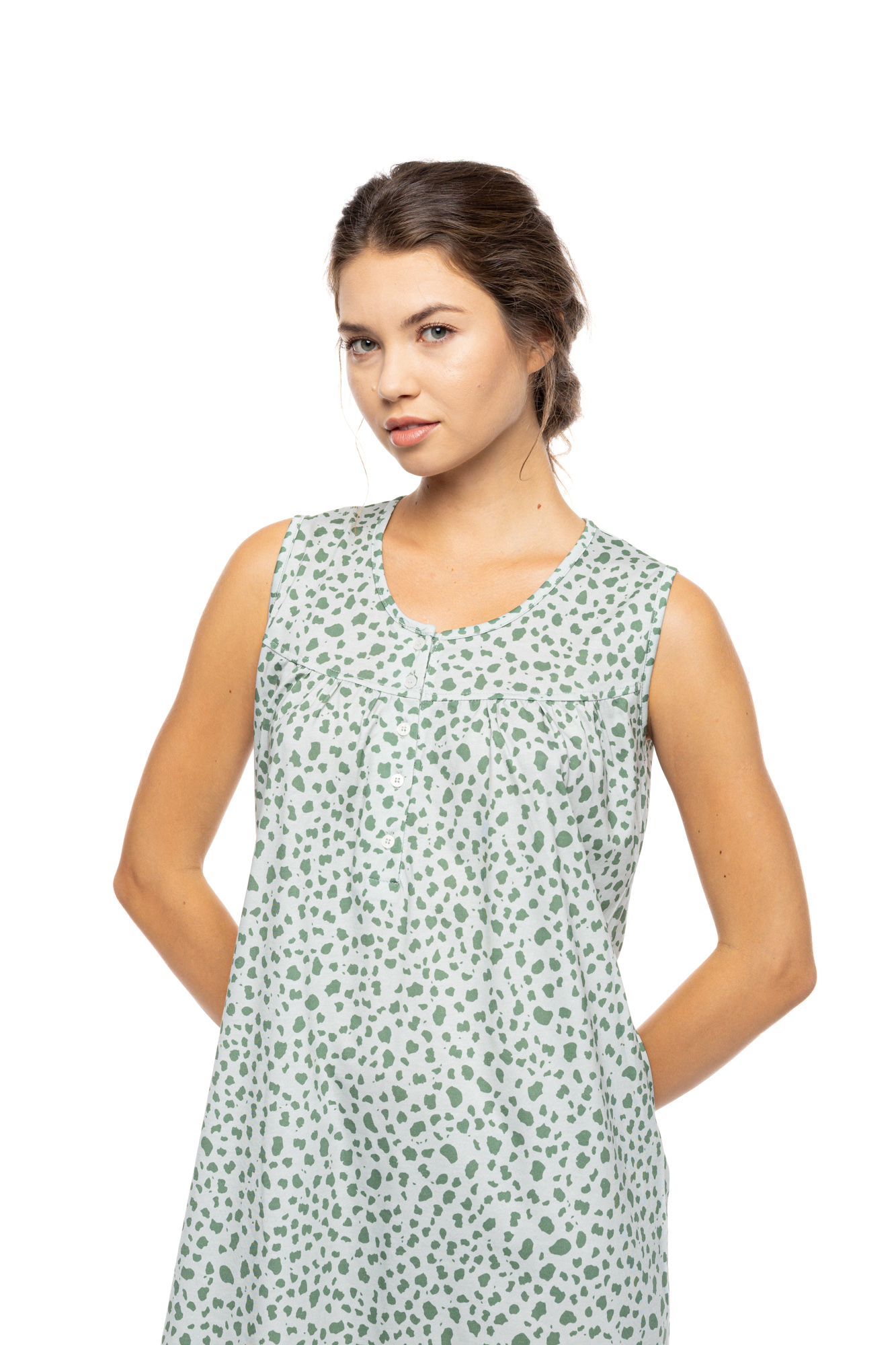 Γυναικείο καλοκαιρινό νυχτικό Pink Label. Κομψό νυχτικό Αμάνικο - πατιλέτα σε ίσια γραμμή με κλασσική λαιμόκοψη. Το απόλυτο δροσερό βαμβακερό υφάσμα σε συνδυασμό με το γήινο χρώμα Jade  Leo   το καθιστά ιδανίκο για όλο το καλοκαίρι.