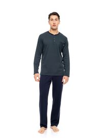 Ανδρική πυτζάμα βαμβακερή Galaxy. Homewear Set από μακρυμάνικη μπλούζα ραφ, με λεκτικό τύπωμα στο στήθος, στρογγυλή λαιμόκοψη με μανσέτες και παντελόνι σε σκούρο μπλε χρώμα με μαλακό λάστιχο στην μέση και στους αστραγάλους.