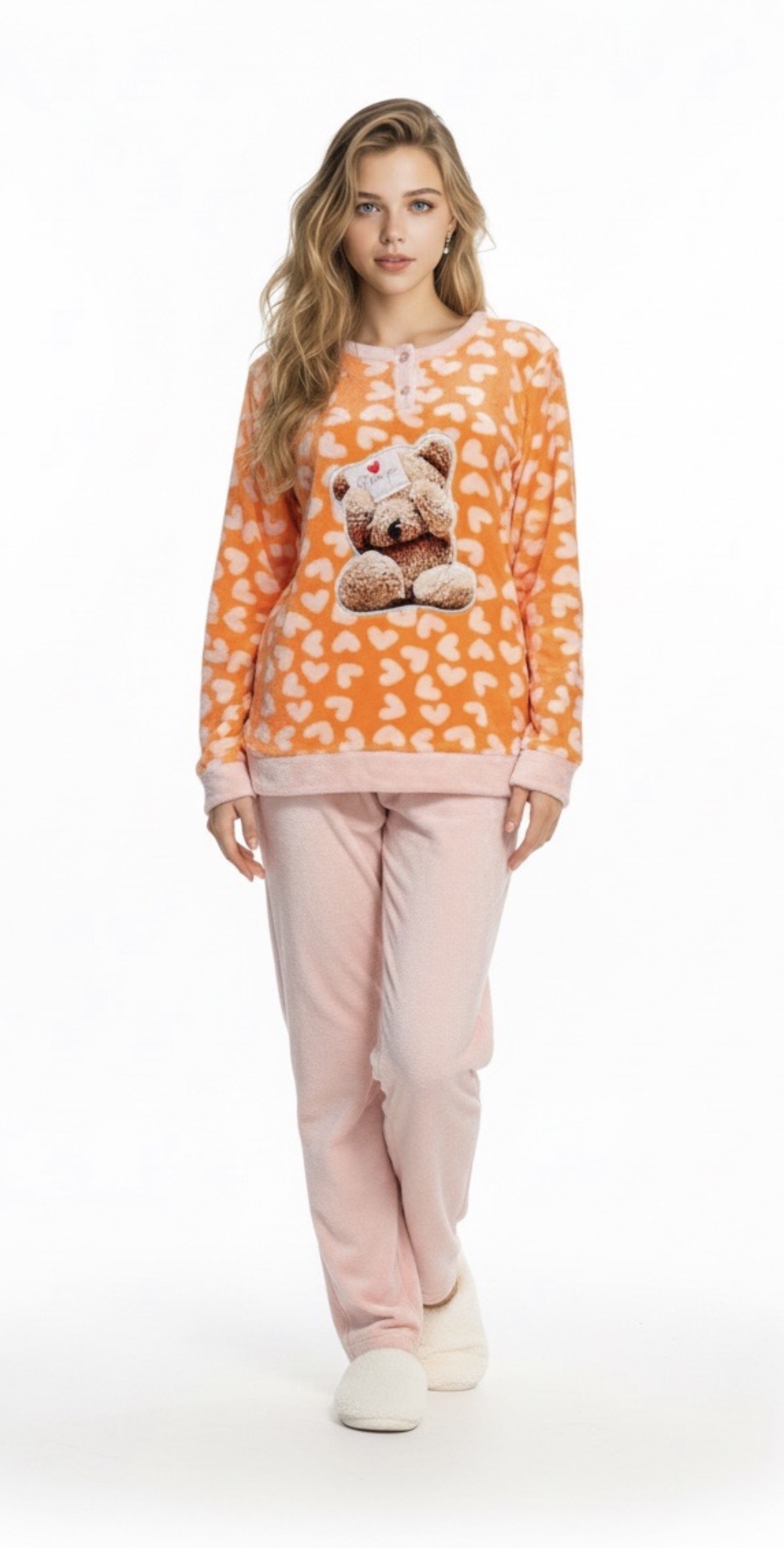 Γυναικεία πυτζάμα Doremi Fleece. Μπλούζα σε Πορτοκαλί απόχρωση. Μακρύ παντελόνι σε ίσια γραμμή με μαλακό λάστιχο στην μέση.