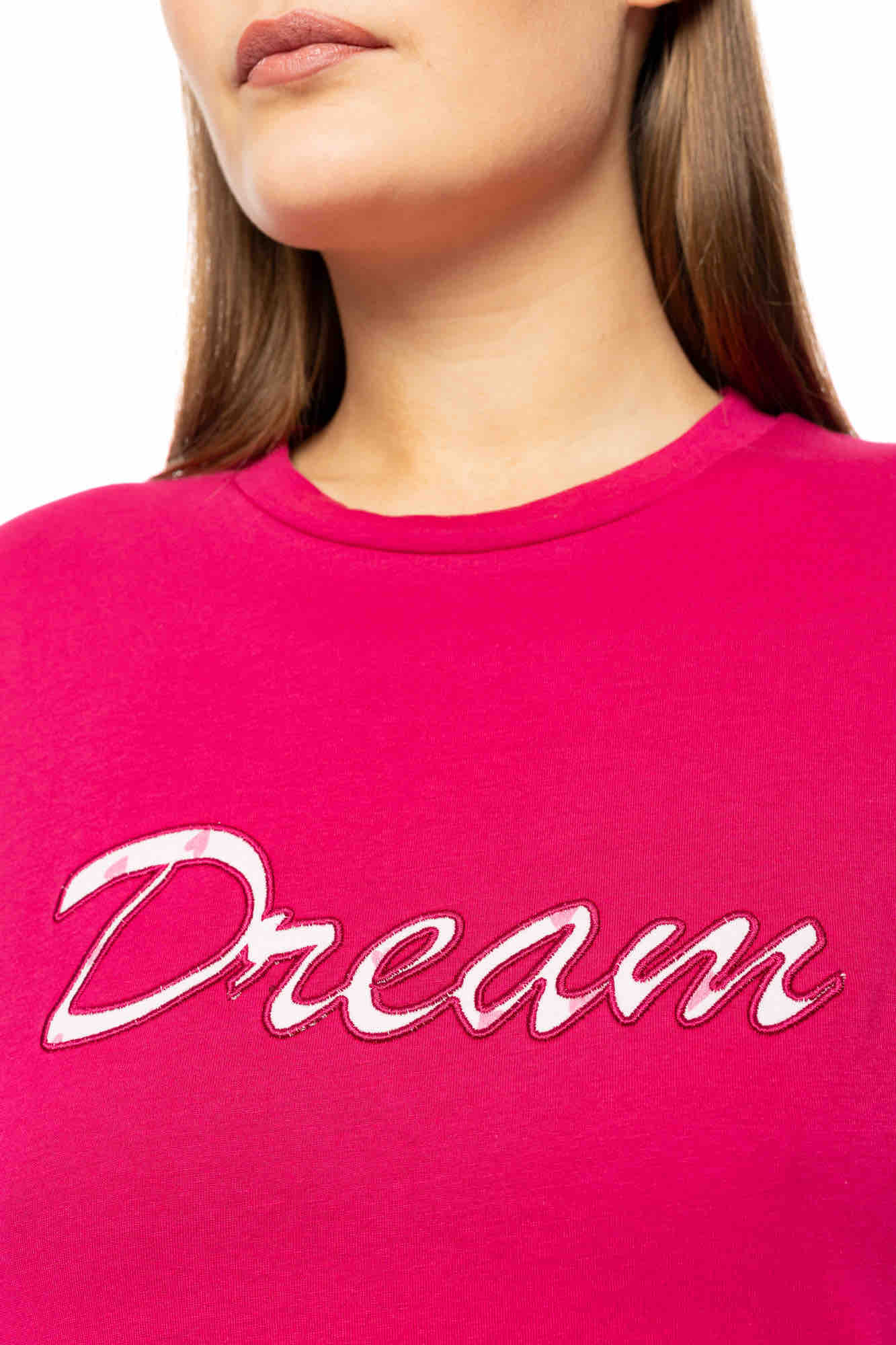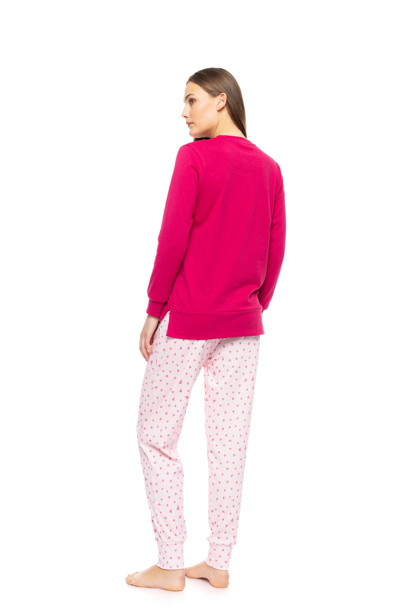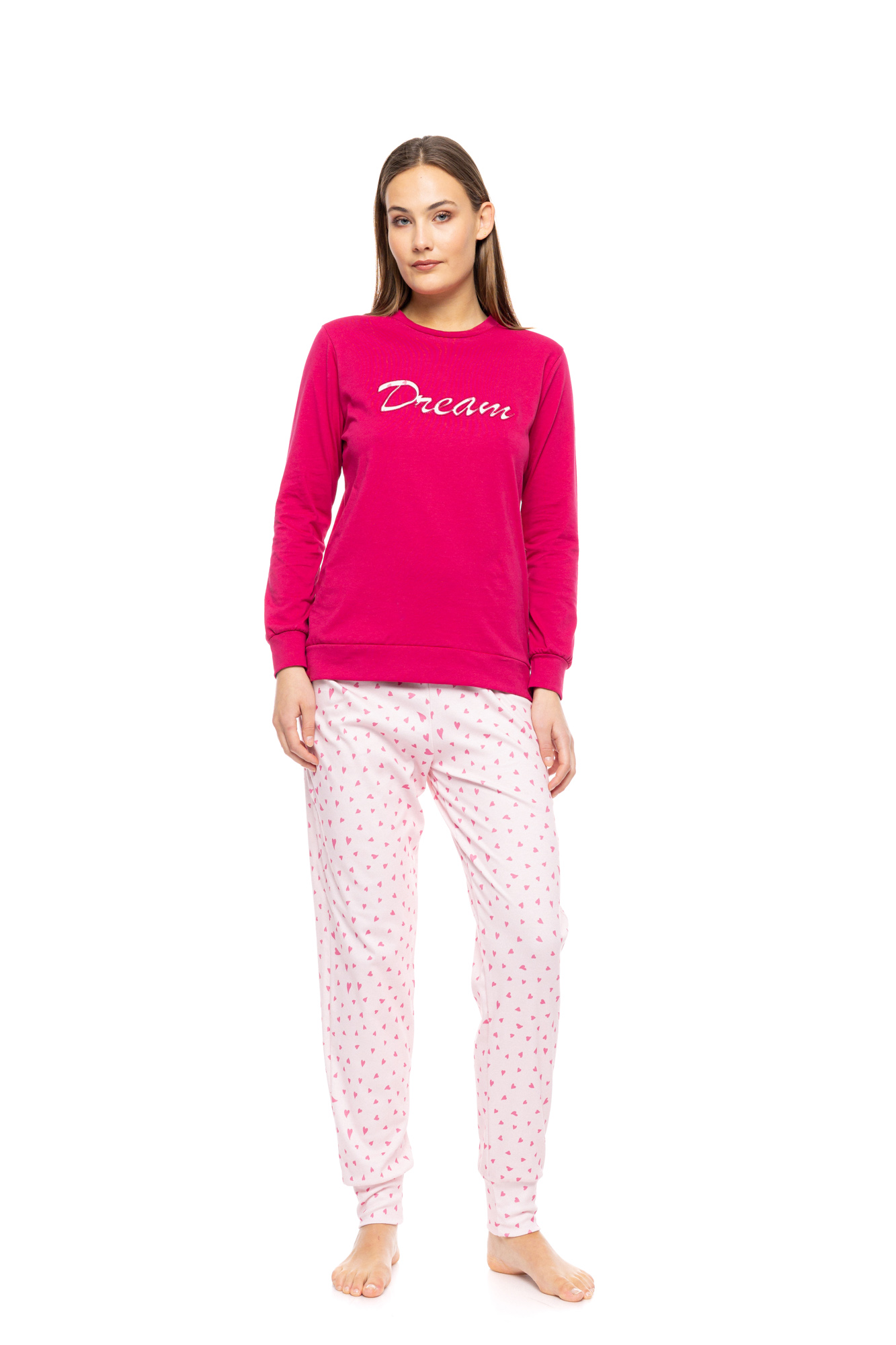 Γυναικεία πυτζάμα Pink Label με λάστιχο στα τελειώματα. Μακρυμάνικη μπλούζα έντονη ροζ με λεκτικό print στο στήθος. Μακρύ παντελόνι με print καρδιές σε ίσια γραμμή με μαλακό λάστιχο στην μέση.