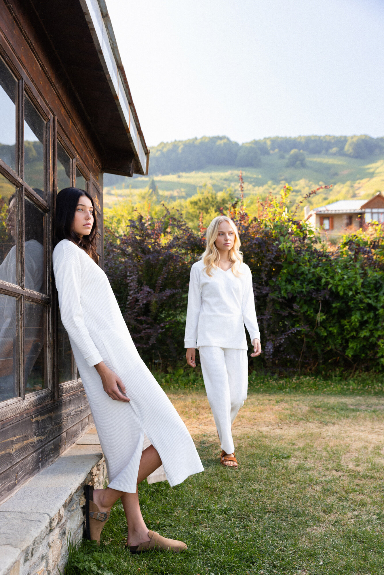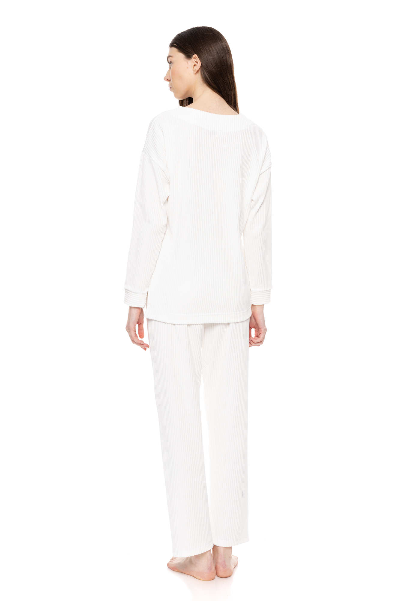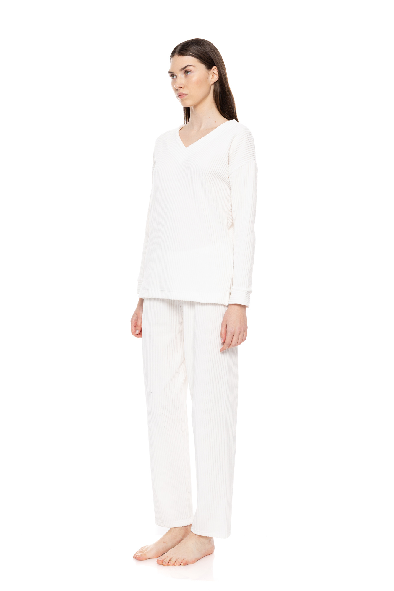 Γυναικεία πυτζάμα Pink Label από πολύ μαλακό και ζεστό βελουτέ ύφασμα. Λευκή μακρυμάνικη μπλούζα σε ίσια γραμμή με V λαιμόκοψη και μανσέτες. Μακρύ παντελόνι σε ίσια γραμμή με μαλακό λάστιχο στην μέση.
