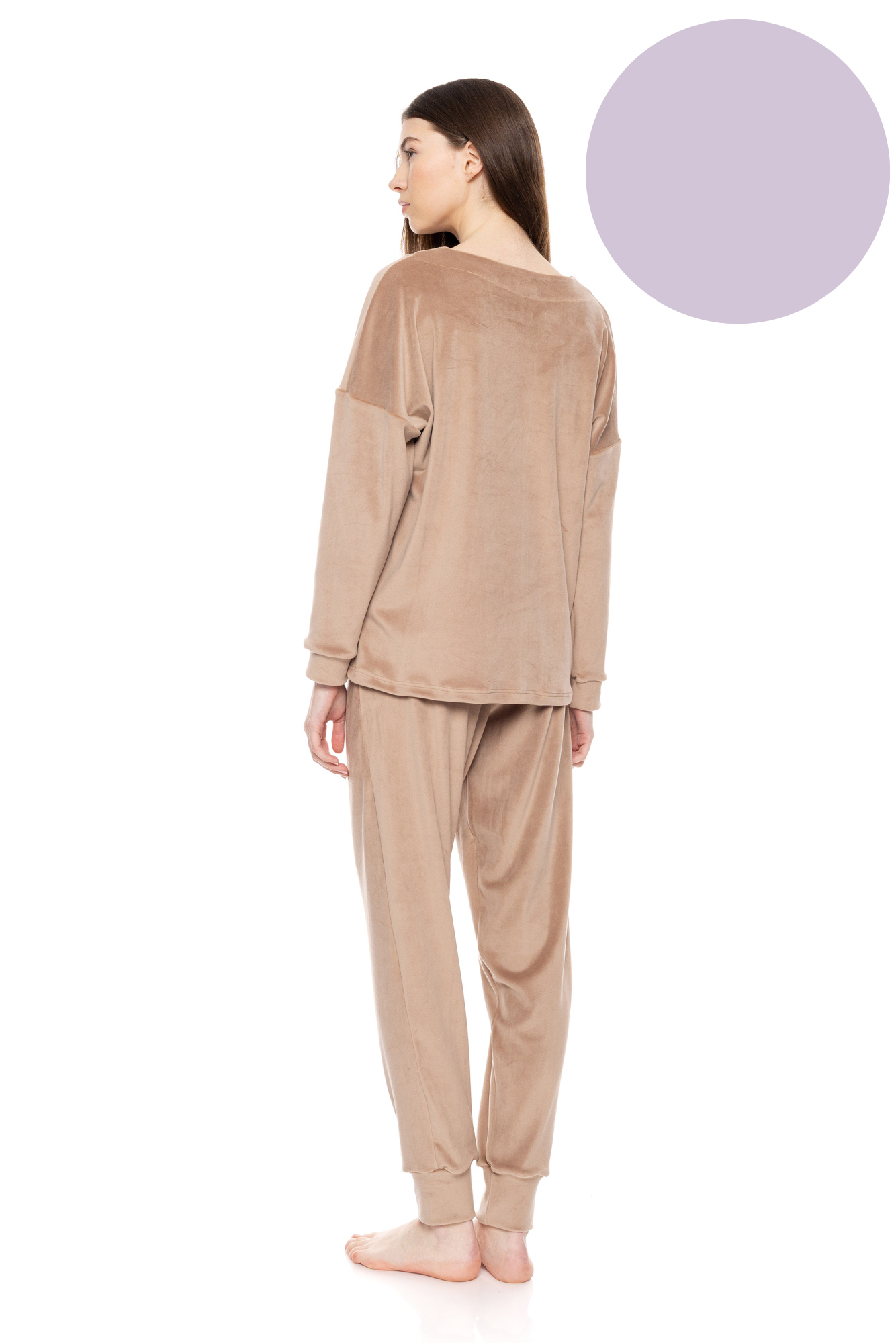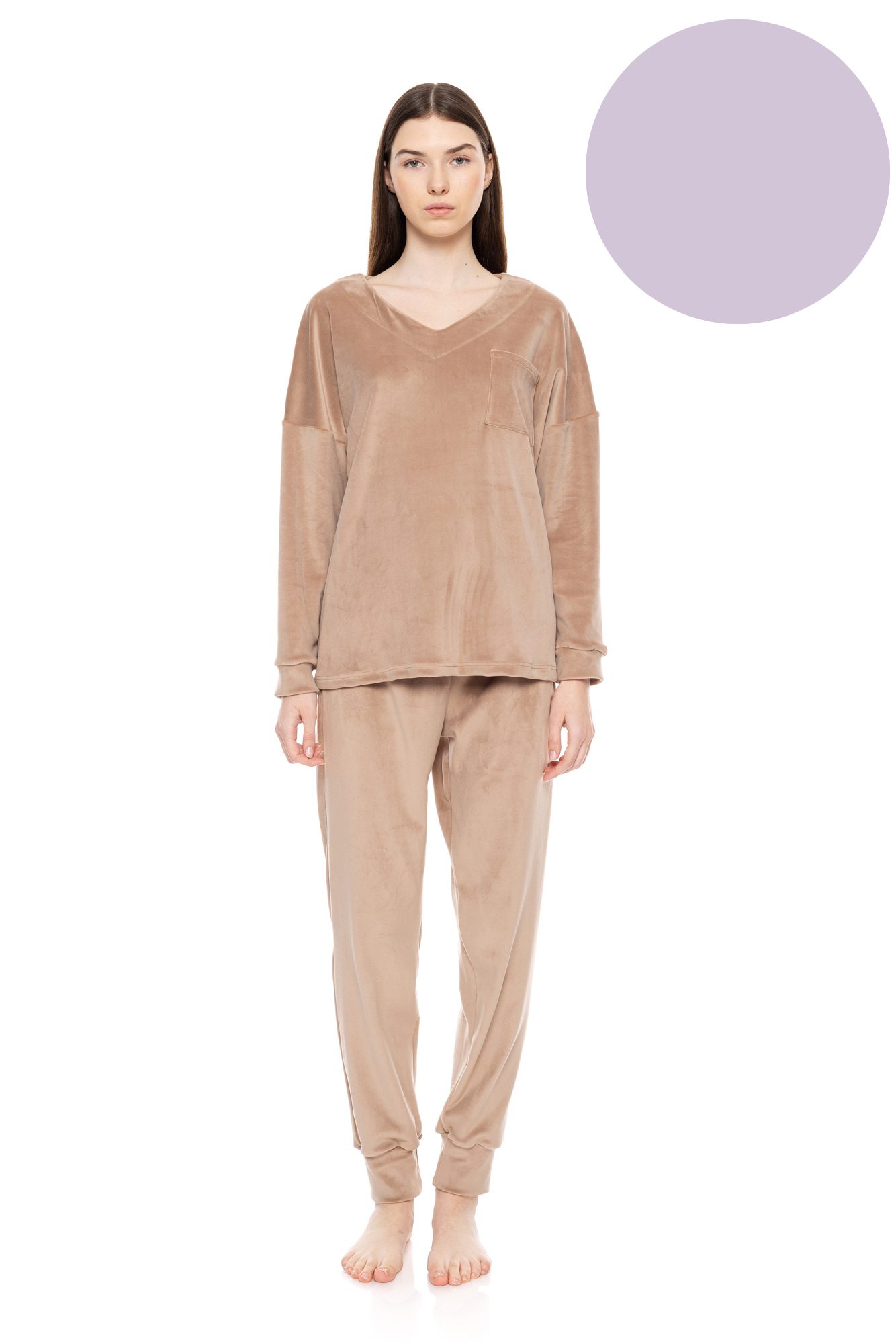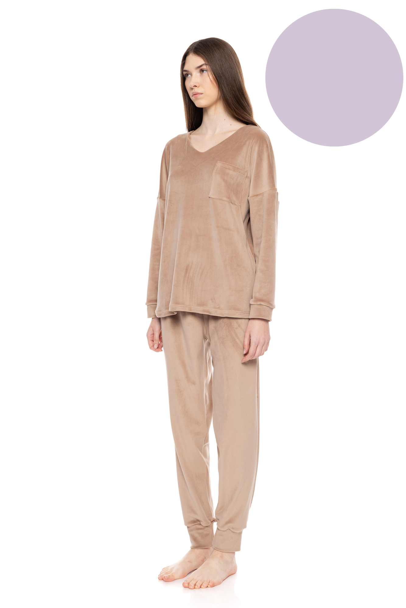 Γυναικεία πυτζάμα Pink Label από πολύ μαλακό και ζεστό βελουτέ ύφασμα. Violete μακρυμάνικη μπλούζα σε άνετη γραμμή με V λαιμόκοψη και μανσέτες. Μακρύ παντελόνι σε ίσια γραμμή με μαλακό λάστιχο στην μέση και στους αστραγάλους.