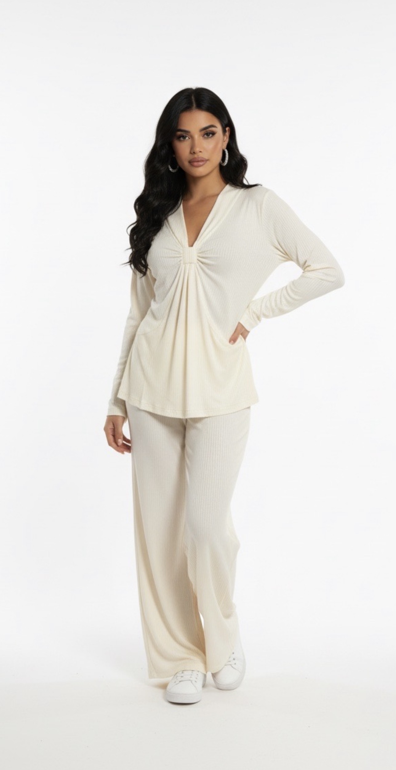 Γυναικεία πυτζάμα Verde Veronica - 100% Modal - Cream απόχρωση. Μπλούζα σε Cream απόχρωση, με σατέν λεπτομέρειες στα μανίκια. Μακρύ παντελόνι σε ίσια γραμμή με μαλακό λάστιχο στην μέση.