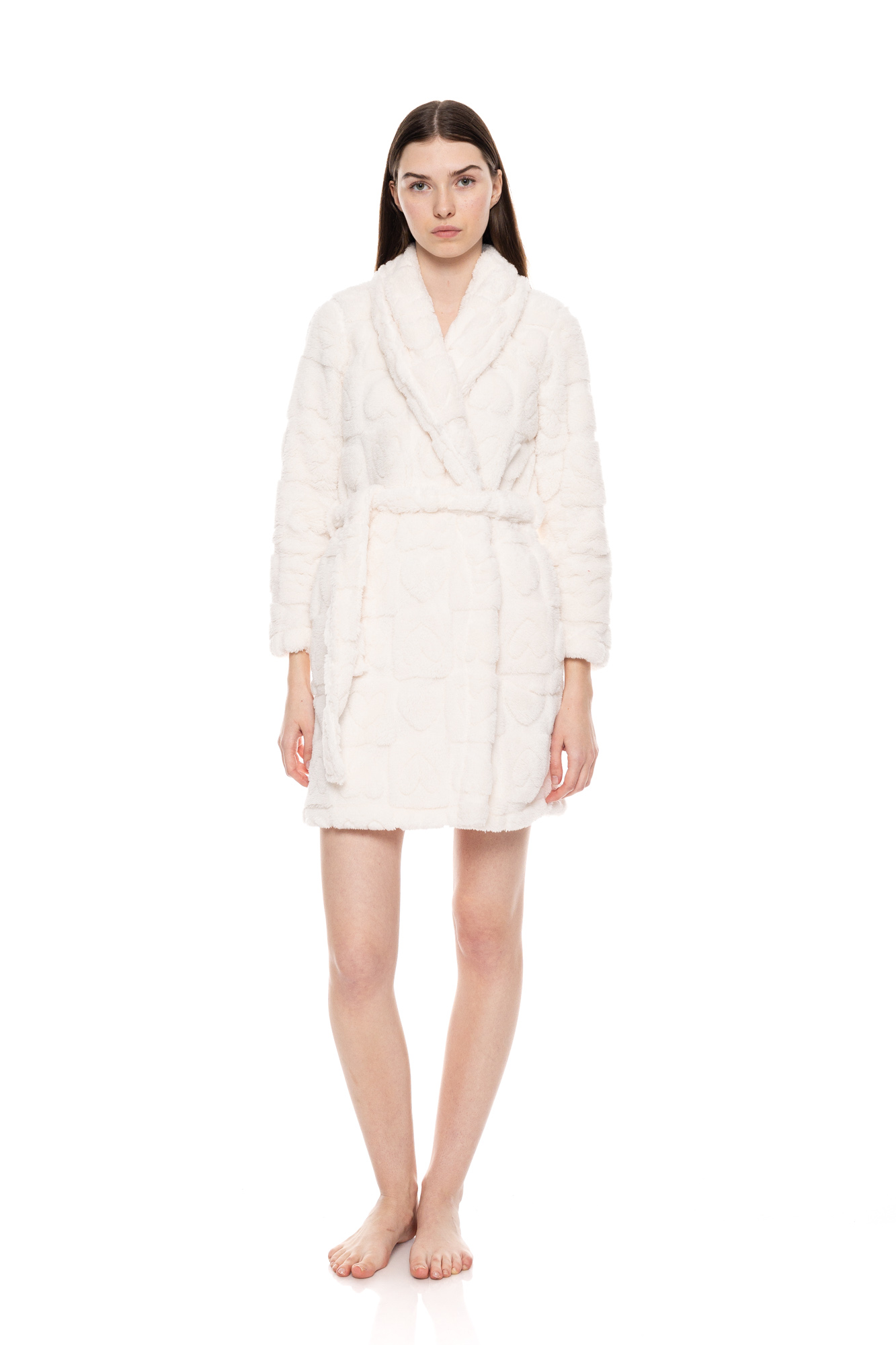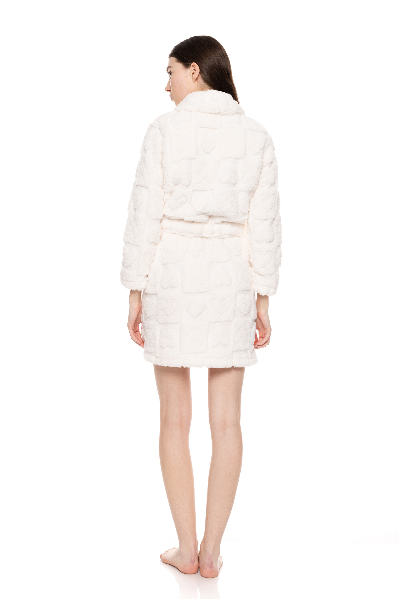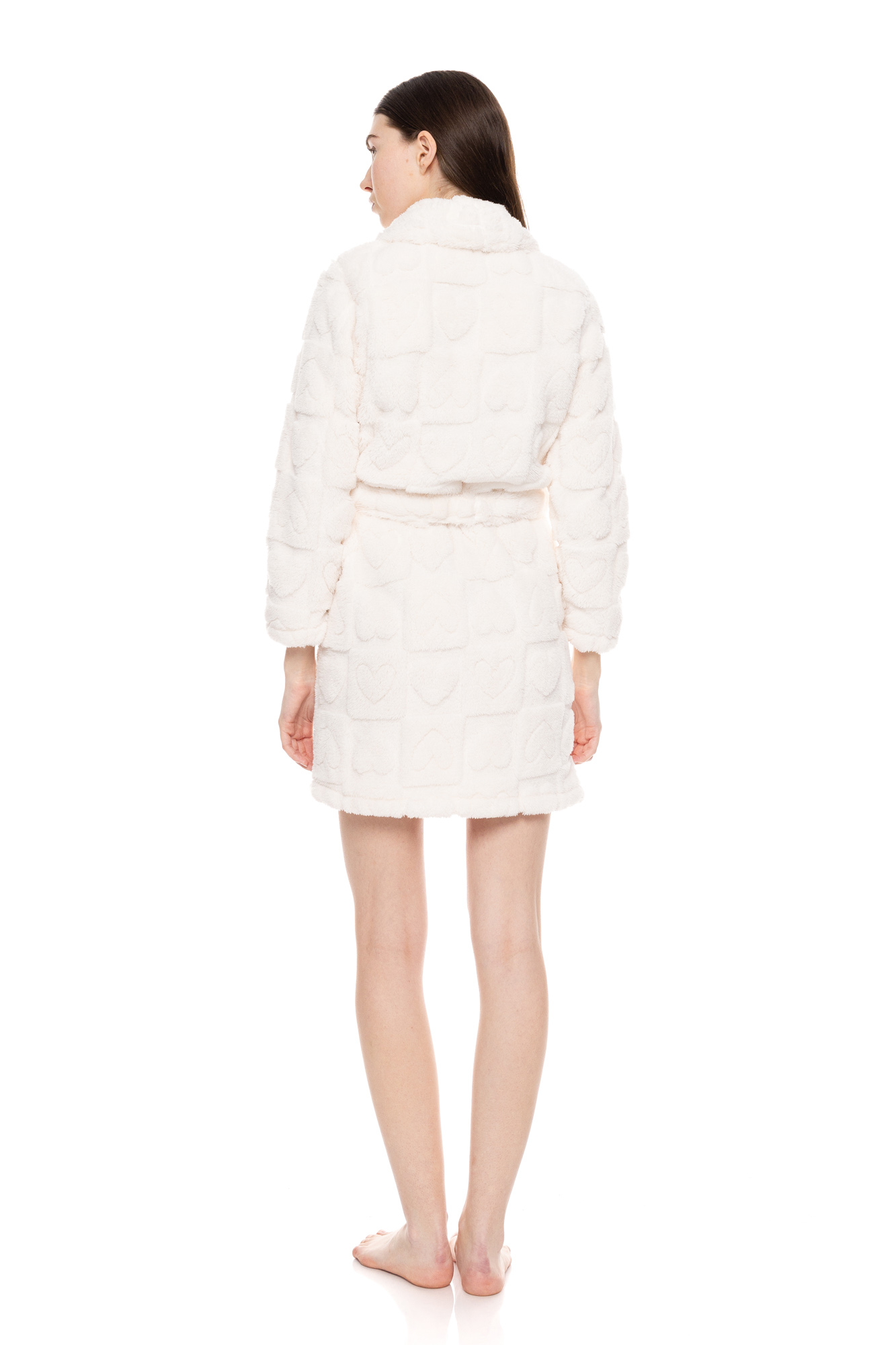 Γυναικεία Ρόμπα με μακρύ μανίκι Pink Label Love. Νεανική Ρόμπα κοντή λευκή σε ίσια γραμμή κατασκευασμένη από ζεστό fleece ύφασμα με ανάγλυφες καρδιές, ζώνη για δέσιμο στην μέση και τσέπες.