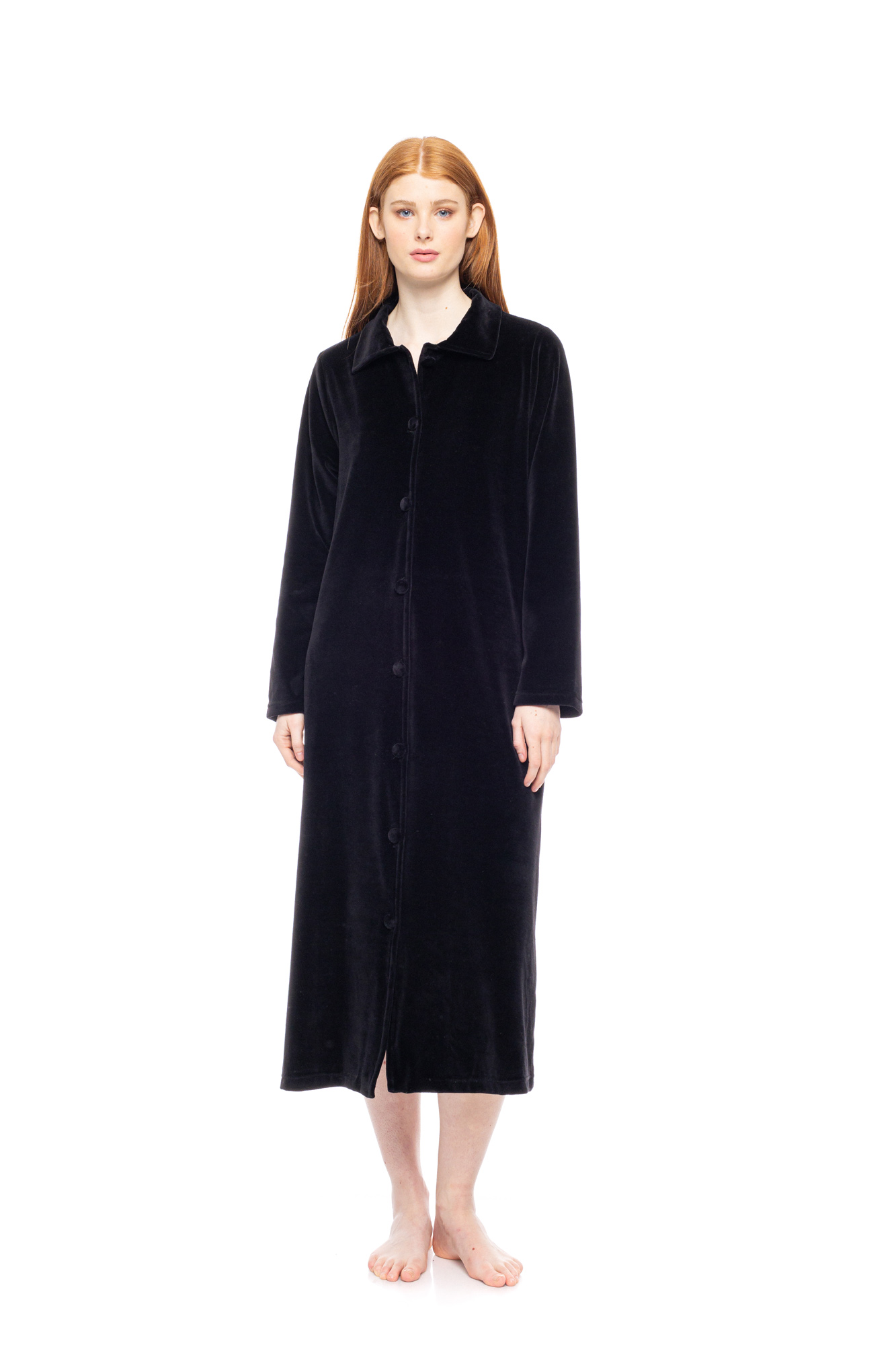 Γυναικεία Ρόμπα με μακρύ μανίκι Pink Label velvet μαύρη. Νεανική Ρόμπα maxi σε ίσια γραμμή κατασκευασμένη από απαλό και ζεστό ύφασμα, τσέπες και κλείσιμο με κουμπιά.