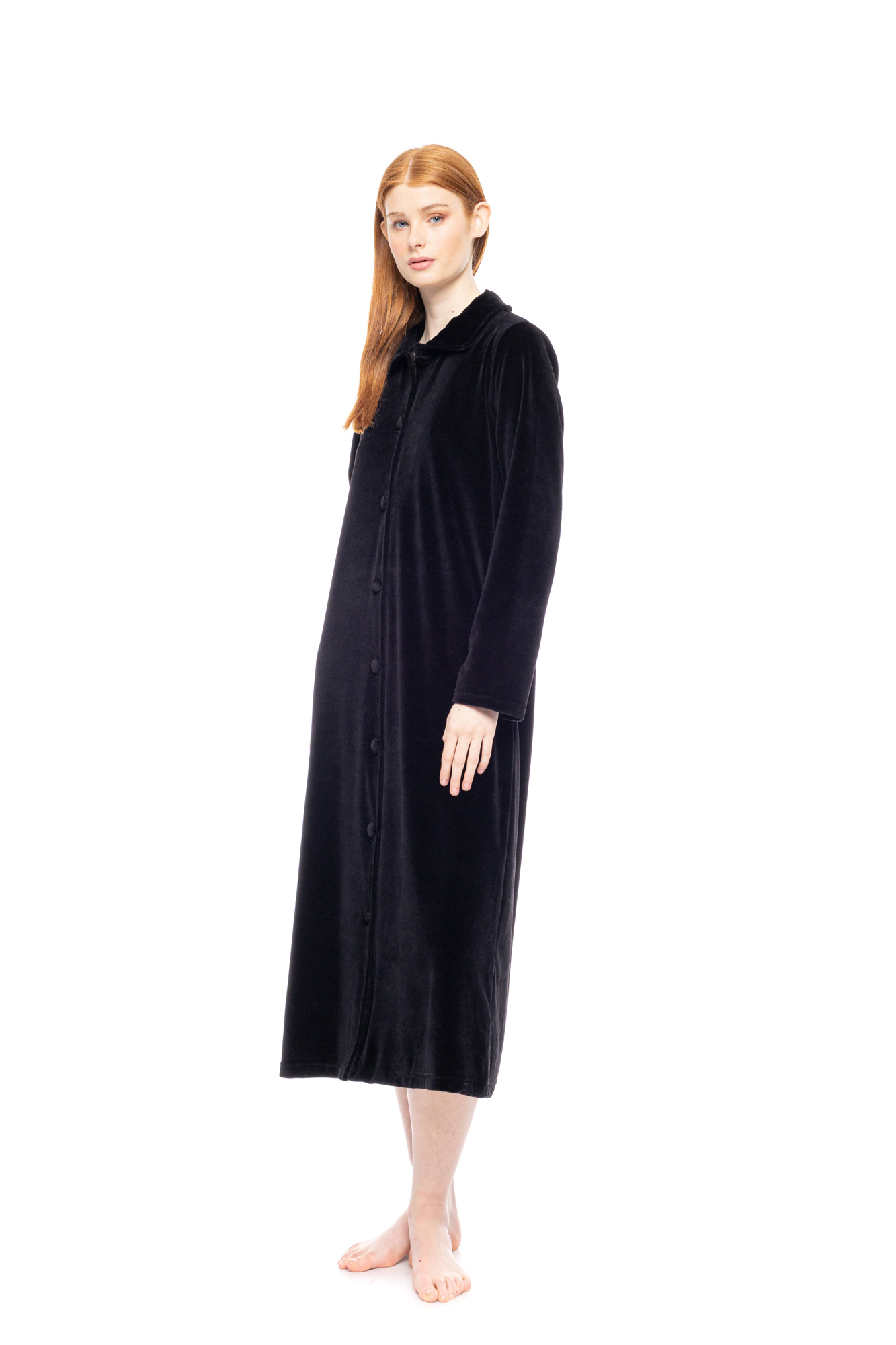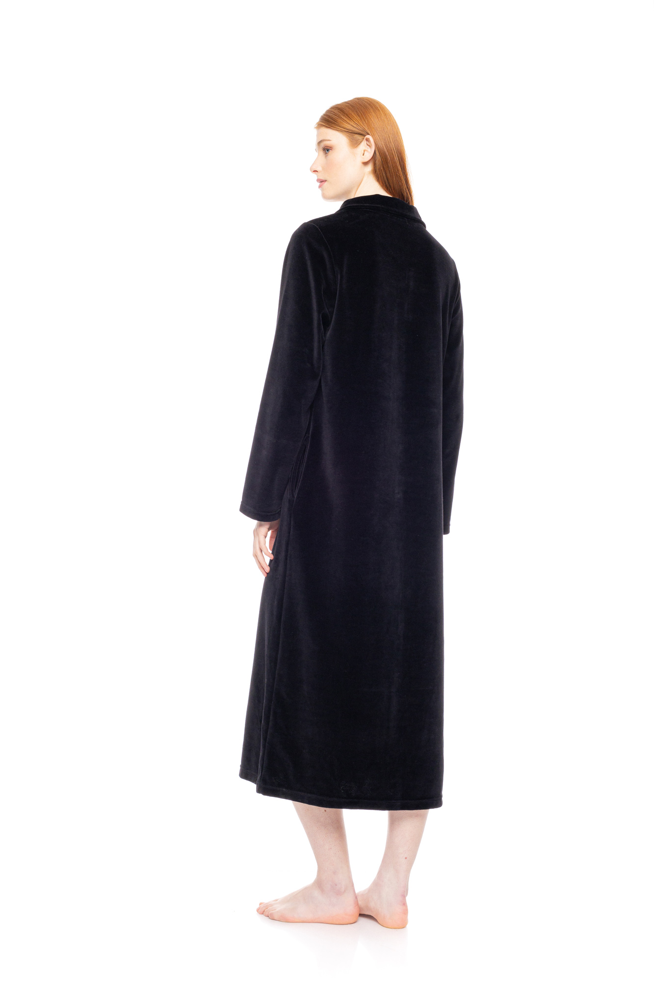 Γυναικεία Ρόμπα με μακρύ μανίκι Pink Label velvet μαύρη. Νεανική Ρόμπα maxi σε ίσια γραμμή κατασκευασμένη από απαλό και ζεστό ύφασμα, τσέπες και κλείσιμο με κουμπιά.