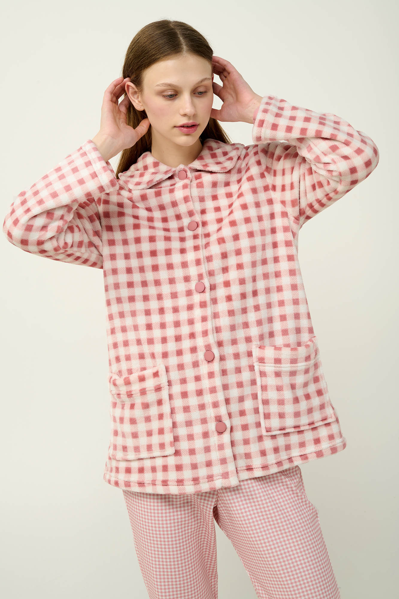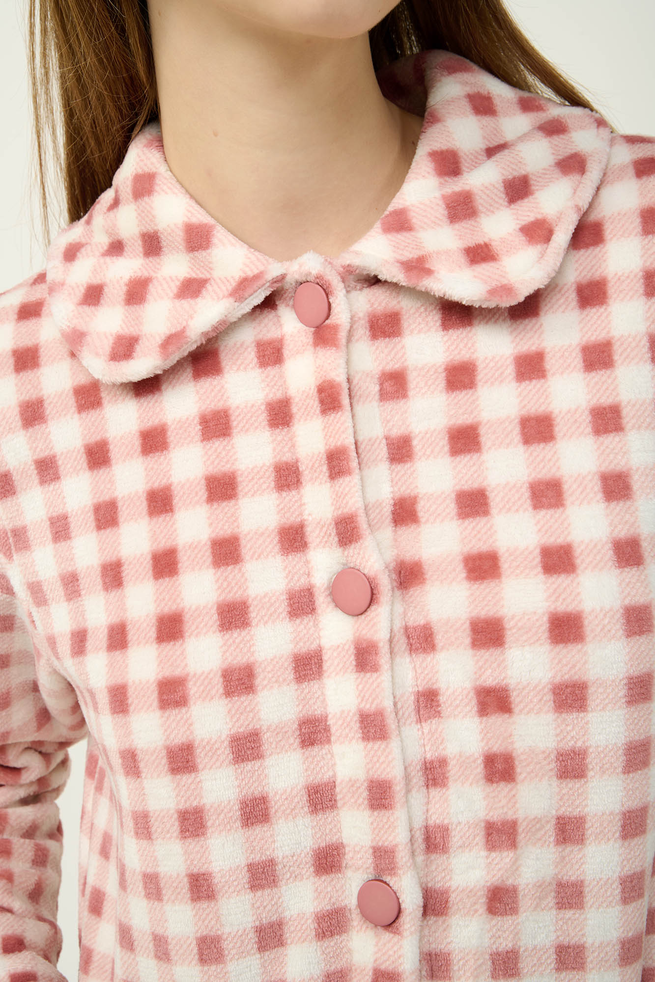 Ανανεώστε τη χειμερινή σας γκαρνταρόμπα με αυτή τη ζεστή γυναικεία ρόμπα σε γοητευτικό, ροζ καρό μοτίβο. Σχεδιασμένη για άνεση και ευκολία, διαθέτει κλασικό γιακά, κουμπιά μπροστά και πρακτικές πλαϊνές τσέπες για να διατηρείτε ζεστά τα χέρια σας ή να έχετε επάνω σας απαραίτητα αντικείμενα. Το απαλό fleece ύφασμα προσφέρει ζεστή αίσθηση, κάνοντάς την ιδανική για να τη φορέσετε πάνω από τις αγαπημένες σας πυτζάμες τις κρύες μέρες του χειμώνα.