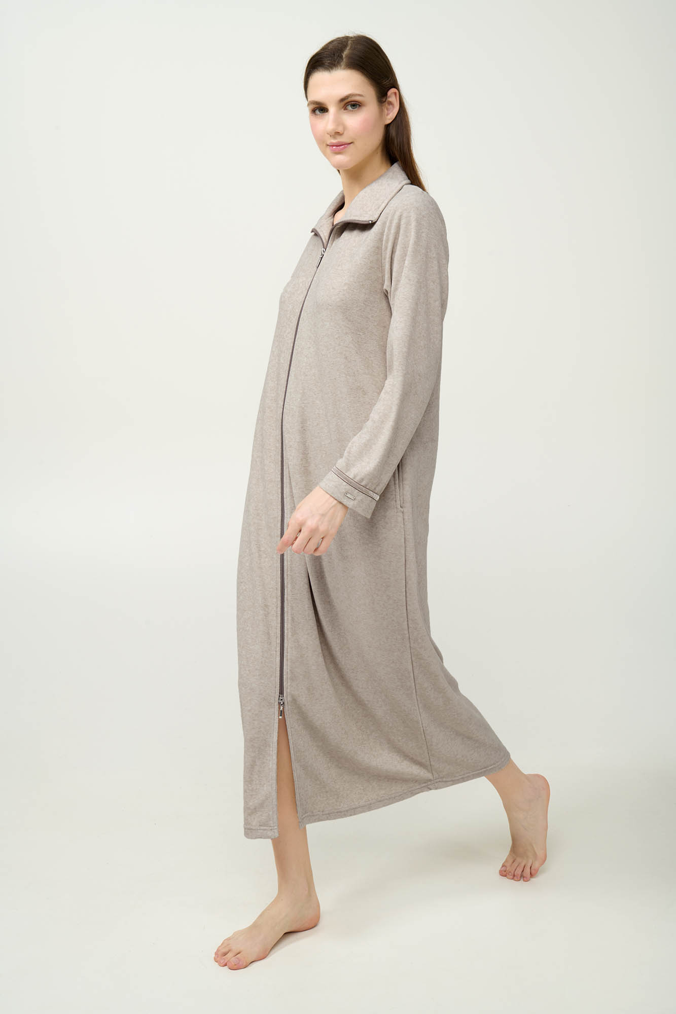 Προσθέστε στην γκαρνταρόμπα σας αυτή τη γυναικεία χειμερινή ρόμπα, κατασκευασμένη από απαλό frottee ύφασμα με ελαστάνη, που χαρίζει άνεση και κομψή εφαρμογή. Σχεδιασμένη με μακριά μανίκια και πρακτικές πλαϊνές τσέπες, κλείνει μπροστά με φερμουάρ για να φορεθεί εύκολα πάνω από τις αγαπημένες σας πυτζάμες.