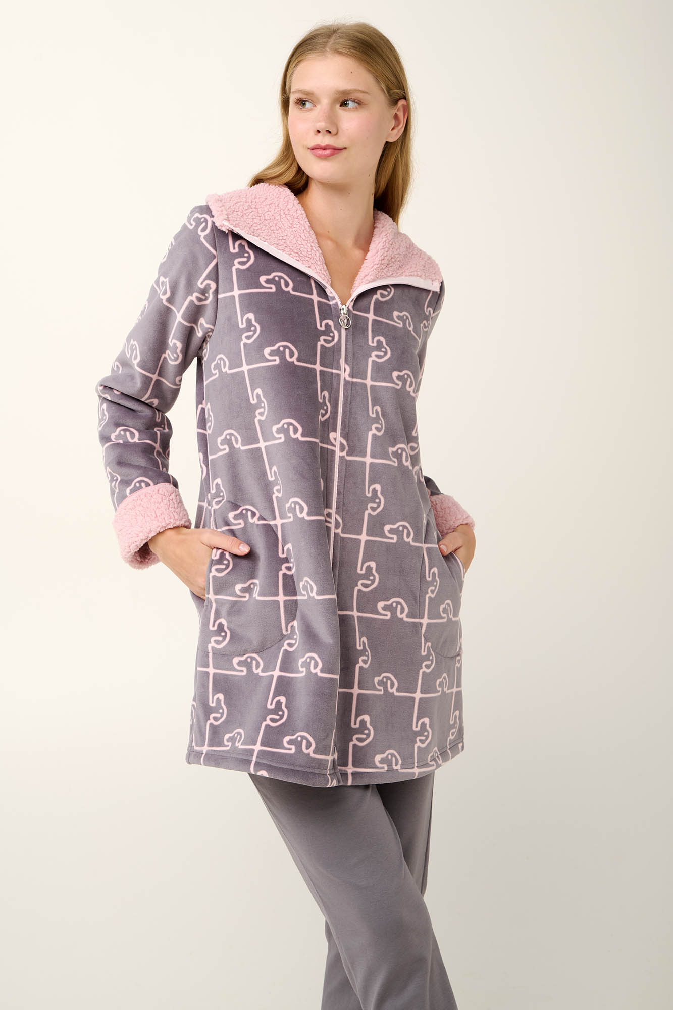 Αποκτήστε μια γυναικεία ρόμπα σε χαριτωμένο σκύλο-παζλ μοτίβο, κατασκευασμένη από ενισχυμένο διπλό fleece που θα σας κρατήσει ζεστή ακόμα και τις πιο κρύες ημέρες. Σχεδιασμένη με τσέπες στο πλάι για να έχετε πάντα κοντά σας προσωπικά αντικείμενα, κλείνει με φερμουάρ και έχει μανσέτες στα μανίκια. Μια πρακτική προσθήκη στη ντουλάπα σας που συνδυάζει πρακτικότητα και άνεση.