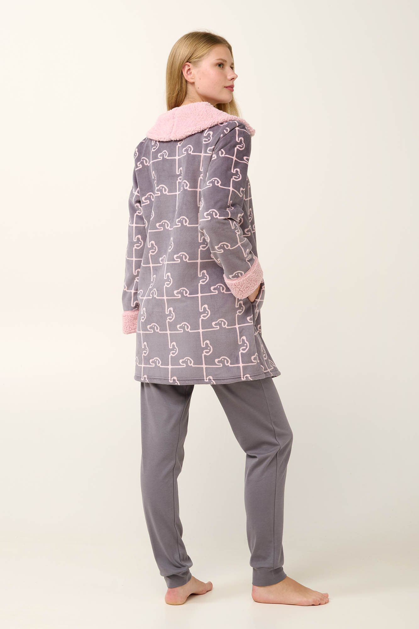 Αποκτήστε μια γυναικεία ρόμπα σε χαριτωμένο σκύλο-παζλ μοτίβο, κατασκευασμένη από ενισχυμένο διπλό fleece που θα σας κρατήσει ζεστή ακόμα και τις πιο κρύες ημέρες. Σχεδιασμένη με τσέπες στο πλάι για να έχετε πάντα κοντά σας προσωπικά αντικείμενα, κλείνει με φερμουάρ και έχει μανσέτες στα μανίκια. Μια πρακτική προσθήκη στη ντουλάπα σας που συνδυάζει πρακτικότητα και άνεση.