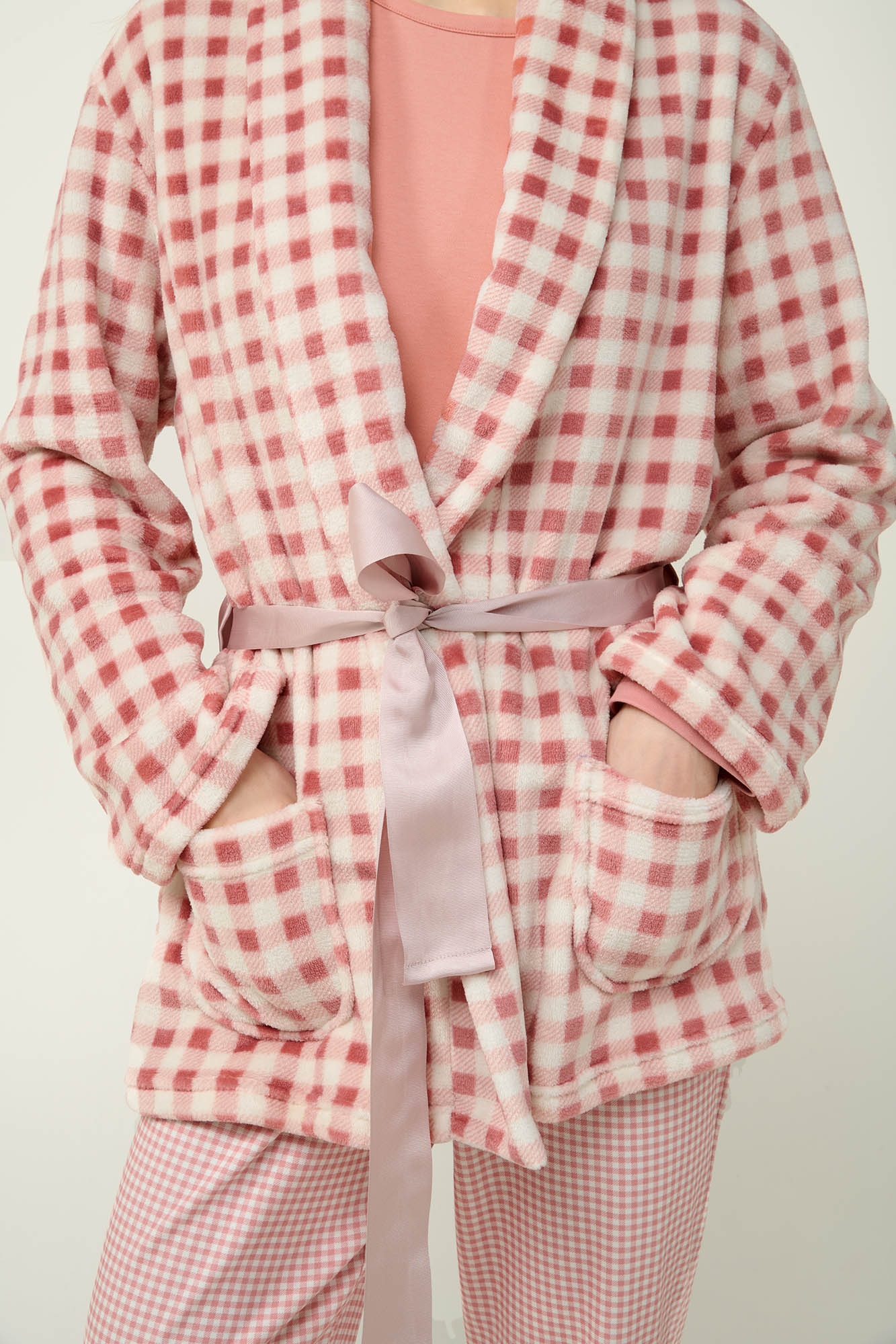 Αφεθείτε στην άνεση που χαρίζει αυτή η γυναικεία ρόμπα σε ροζ καρό μοτίβο. Σχεδιασμένη σε κλασική κρουαζέ γραμμή με απαλό πέτο, δένει μπροστά με κορδέλα για ρυθμιζόμενη εφαρμογή. Οι πλαϊνές τσέπες προσθέτουν πρακτικότητα, ιδανικές για να έχετε απαραίτητα αντικείμενα κοντά σας. Το απαλό fleece ύφασμα προσφέρει διαρκή απαλότητα και ζεστασιά που θα απολαύσετε χαλαρώνοντας στο σπίτι.