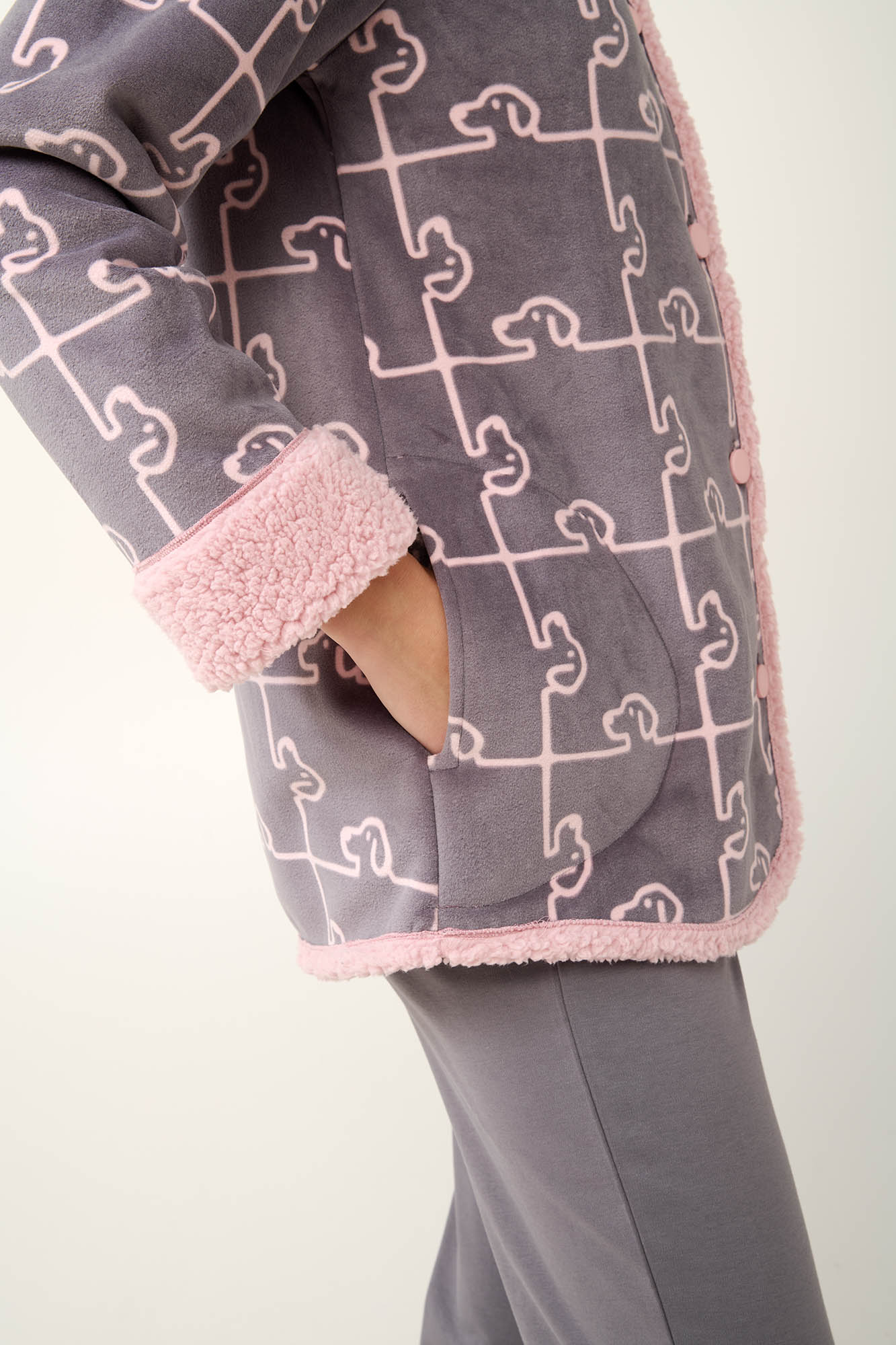 Προσθέστε στη συλλογή σας μια γυναικεία ρόμπα με χαριτωμένο σκύλο-παζλ μοτίβο. Κατασκευασμένη από ενισχυμένο διπλό fleece που θα σας κρατήσει ζεστή ακόμα και τις πιο κρύες ημέρες. Κλείνει μπροστά με κουμπιά, και έχει μανσέτες και κλασικό γιακά που δίνουν μια κλασική νότα στο νεανικό μοτίβο. Συνδυάστε την με τις αγαπημένες σας πυτζάμες και απολαύστε ένα χαλαρό πρωί στο σπίτι.