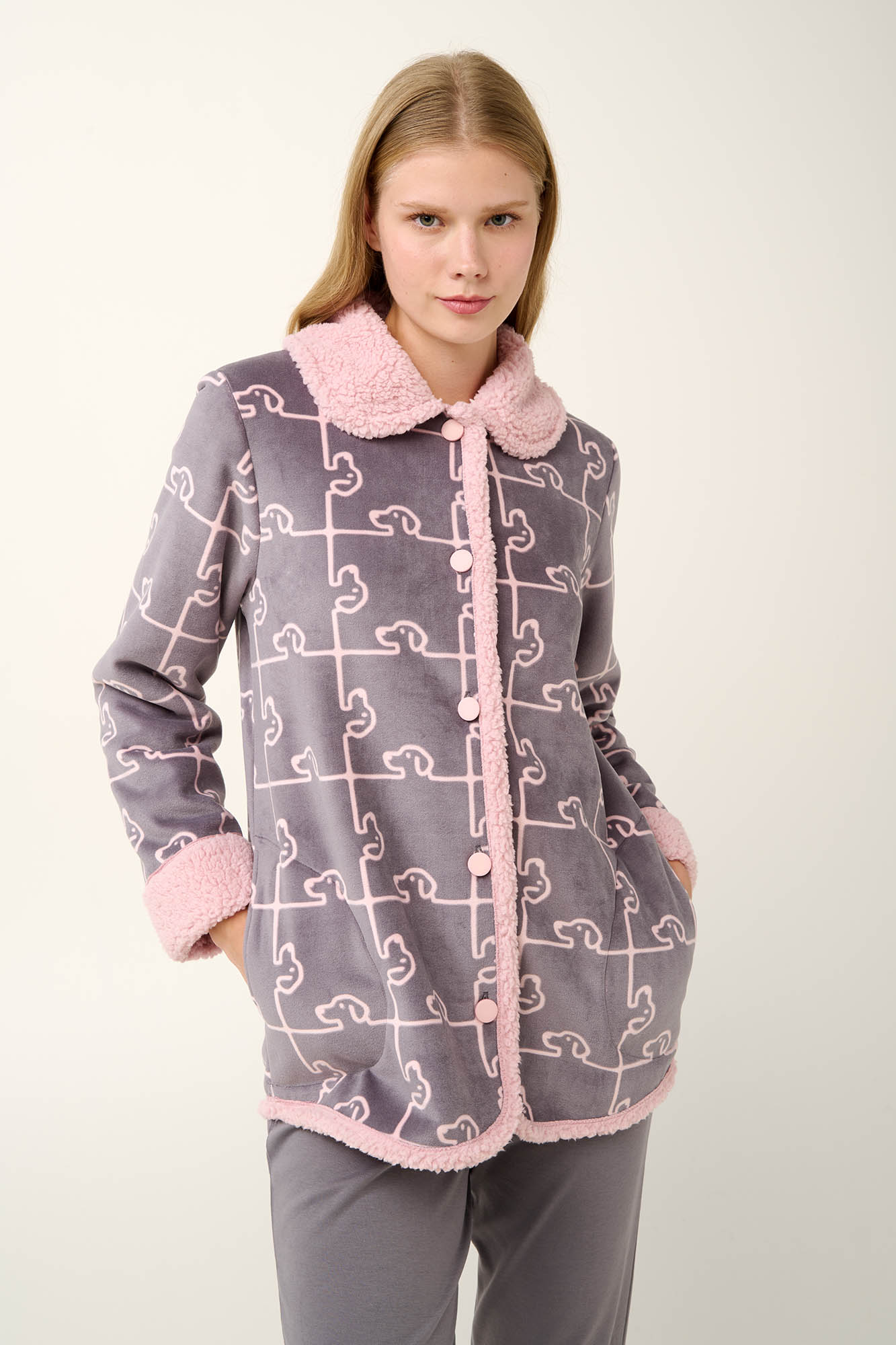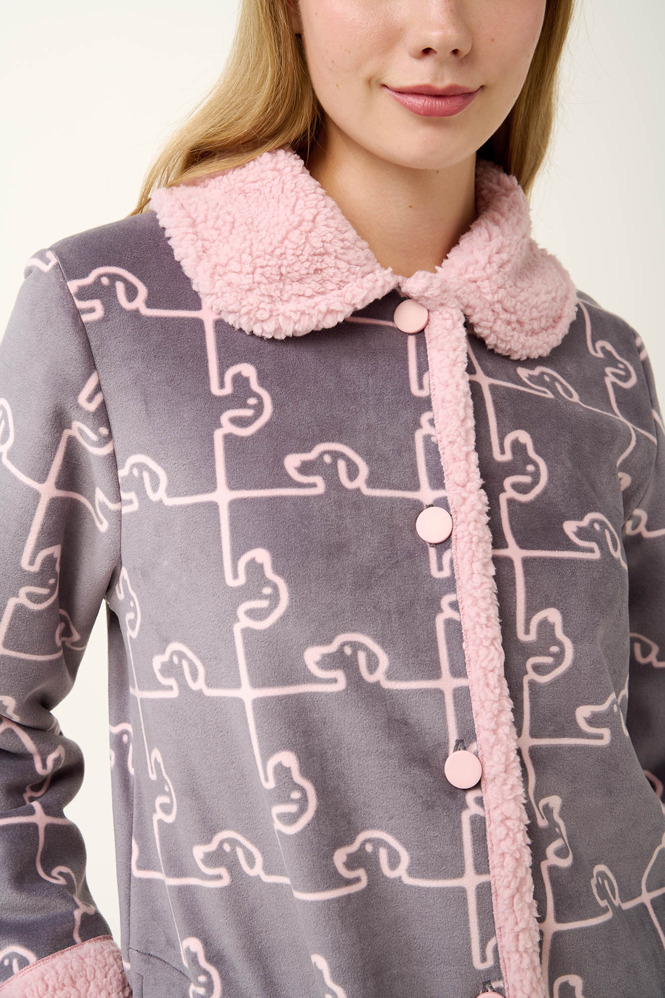 Προσθέστε στη συλλογή σας μια γυναικεία ρόμπα με χαριτωμένο σκύλο-παζλ μοτίβο. Κατασκευασμένη από ενισχυμένο διπλό fleece που θα σας κρατήσει ζεστή ακόμα και τις πιο κρύες ημέρες. Κλείνει μπροστά με κουμπιά, και έχει μανσέτες και κλασικό γιακά που δίνουν μια κλασική νότα στο νεανικό μοτίβο. Συνδυάστε την με τις αγαπημένες σας πυτζάμες και απολαύστε ένα χαλαρό πρωί στο σπίτι.