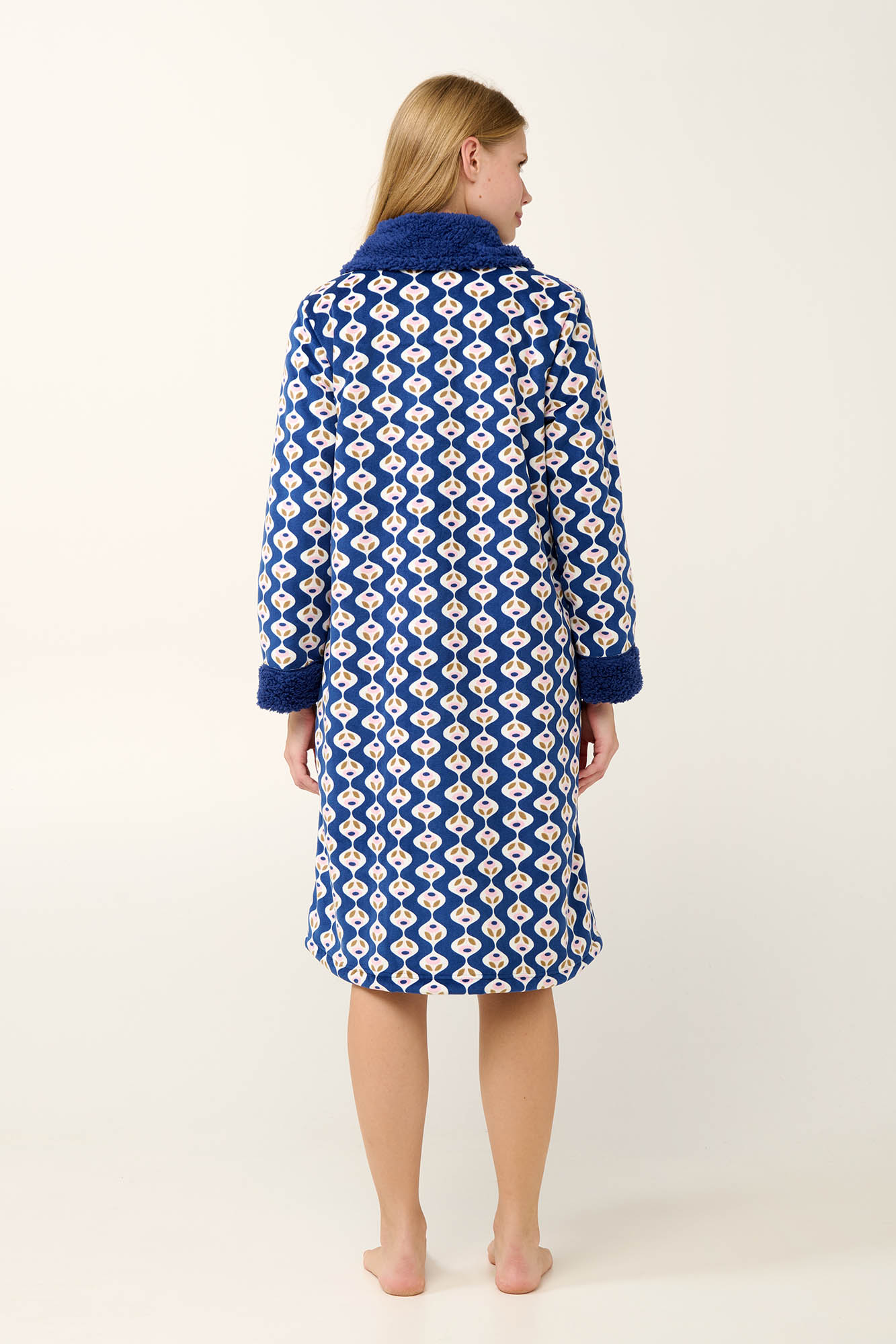 Αποκτήστε μια μακριά γυναικεία ρόμπα σε μπλε αποχρώσεις με ρουστίκ μοτίβο. Κατασκευασμένη από εξαιρετικά απαλό στο σώμα fleece, κλείνει με κουμπιά, έχει πρακτικές τσέπες που σας βοηθούν να κρατήσετε κοντά τα προσωπικά σας αντικείμενα και γιακά που δίνει κλασική κομψότητα στο σύνολο σας. Συνδυάστε τη με την αγαπημένη σας πυτζάμα για ένα ζεστό και ξεκούραστο απόγευμα στον καναπέ.