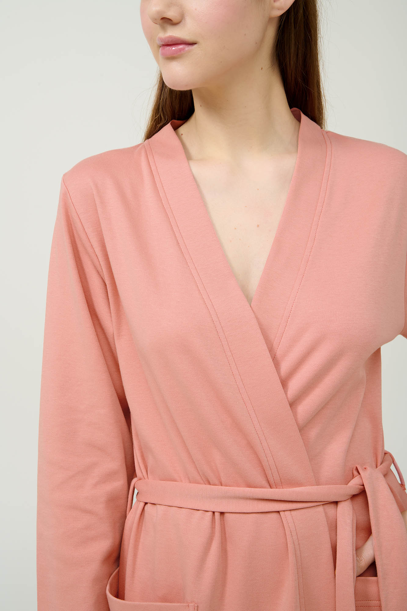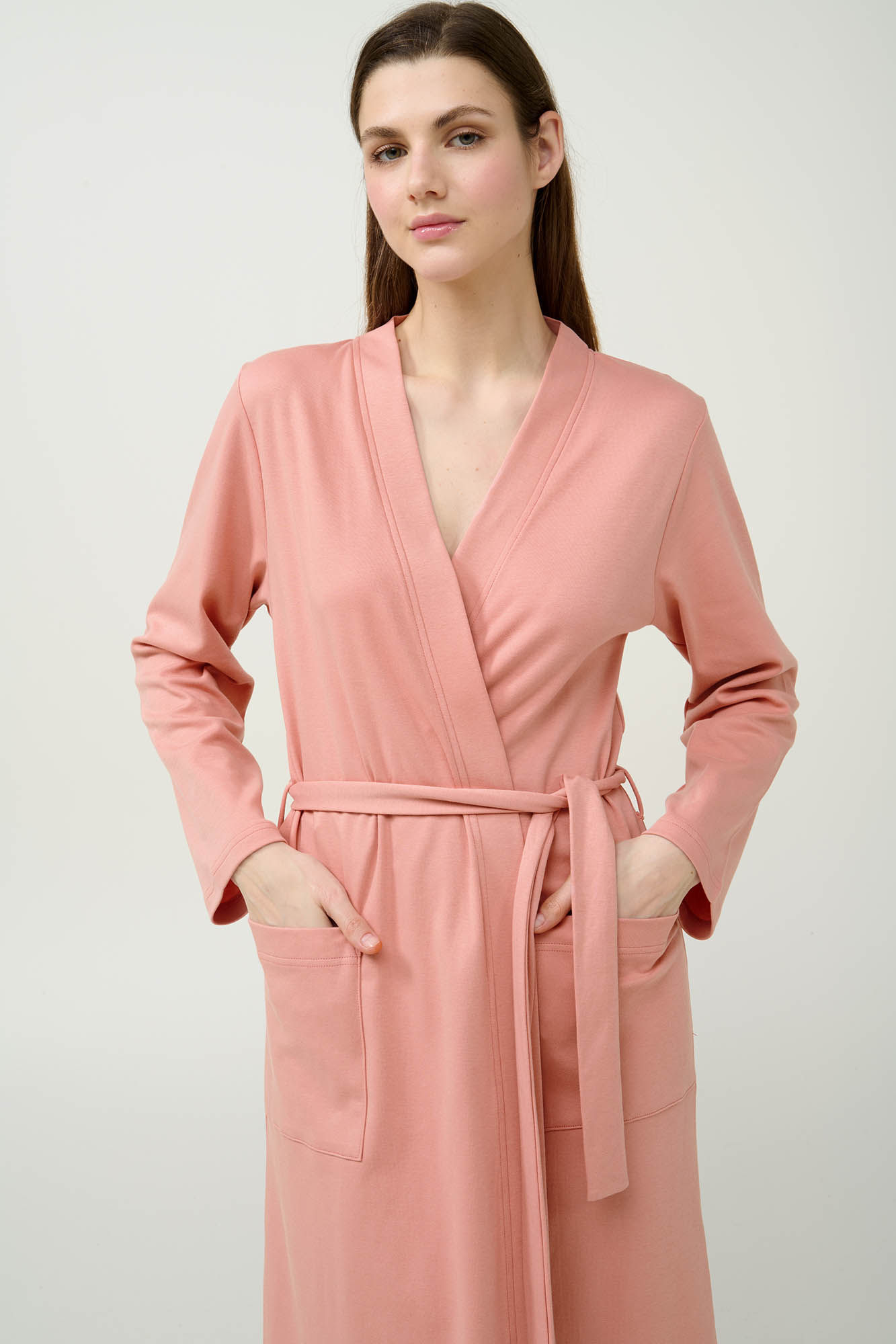 Ανανεώστε τη συλλογή σας με αυτή την κλασική γυναικεία ρόμπα, κατασκευασμένη από απαλό και διαπνέον 100% βαμβακερό interlock. Σχεδιασμένη σε διαχρονικό κρουαζέ σχέδιο με ζώνη που δένει στη μέση, προσφέρει άνετη και σταθερή εφαρμογή για την καθημερινή σας ευκολία. Οι πλαινές τσέπες προσθέτουν πρακτικότητα χωρίς να θυσιάζουν το στυλ, κάνοντάς την ιδανική για κάθε στιγμή της ημέρας.